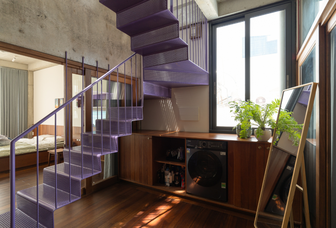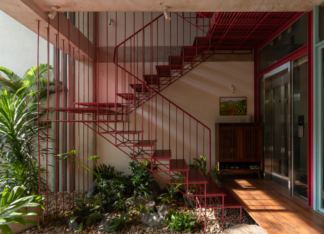 Cầu thang không chỉ là nơi di chuyển mà còn là trục thông gió chính của ngôi nhà. Bậc thang rỗng. Các bậc thang được thiết kế rỗng, tăng cường sự lưu thông không khí theo chiều dọc. Thiết kế thông minh này cho phép tòa nhà "thở" một cách tự nhiên, giúp không khí nóng thoát ra ngoài và luồng khí mát được hút vào.