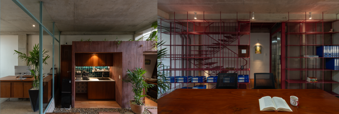 Ngôi nhà được xây dựng với khung bê tông trần, tường chỉ sơn mà không trát vữa, và sàn xi măng đánh bóng. Những vật liệu này không chỉ mang lại vẻ đẹp tối giản, mạnh mẽ mà còn tiết kiệm chi phí hoàn thiện. Ngôi nhà được phân chia chức năng rõ ràng nhưng vẫn đảm bảo sự kết nối theo chiều dọc: Tầng trệt và tầng lửng: Đây là khu vực văn phòng làm việc. Khoảng thông tầng đôi (double-height void) không chỉ tạo sự kết nối về mặt thị giác giữa các khu vực làm việc mà còn tối ưu hóa thông gió tự nhiên.