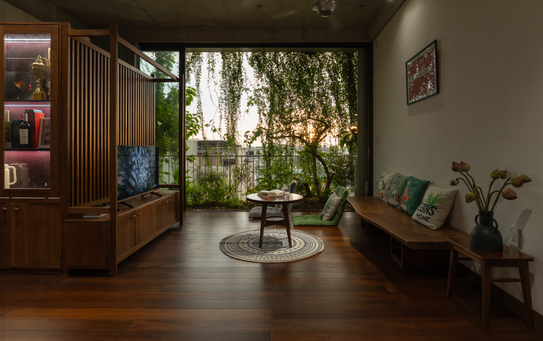 Nội thất chủ yếu sử dụng gỗ tự nhiên, được giữ nguyên ở trạng thái "sống" của nó – chấp nhận những khe hở và sự cong vênh tự nhiên theo thời tiết. Chính sự không hoàn hảo này đã mang lại nét duyên dáng, chân thực và ấm áp cho không gian.