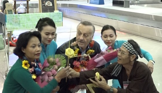 Phó Chủ tịch UBND TPHCM Trần Vĩnh Tuyến cùng lãnh đạo Sở Du lịch TPHCM, Vietnam Airlines chào đón đoàn khách quốc tế đến TPHCM đầu tiên trong năm mới 2018, tại sân bay quốc tế Tân Sơn Nhất. Ảnh: V.N