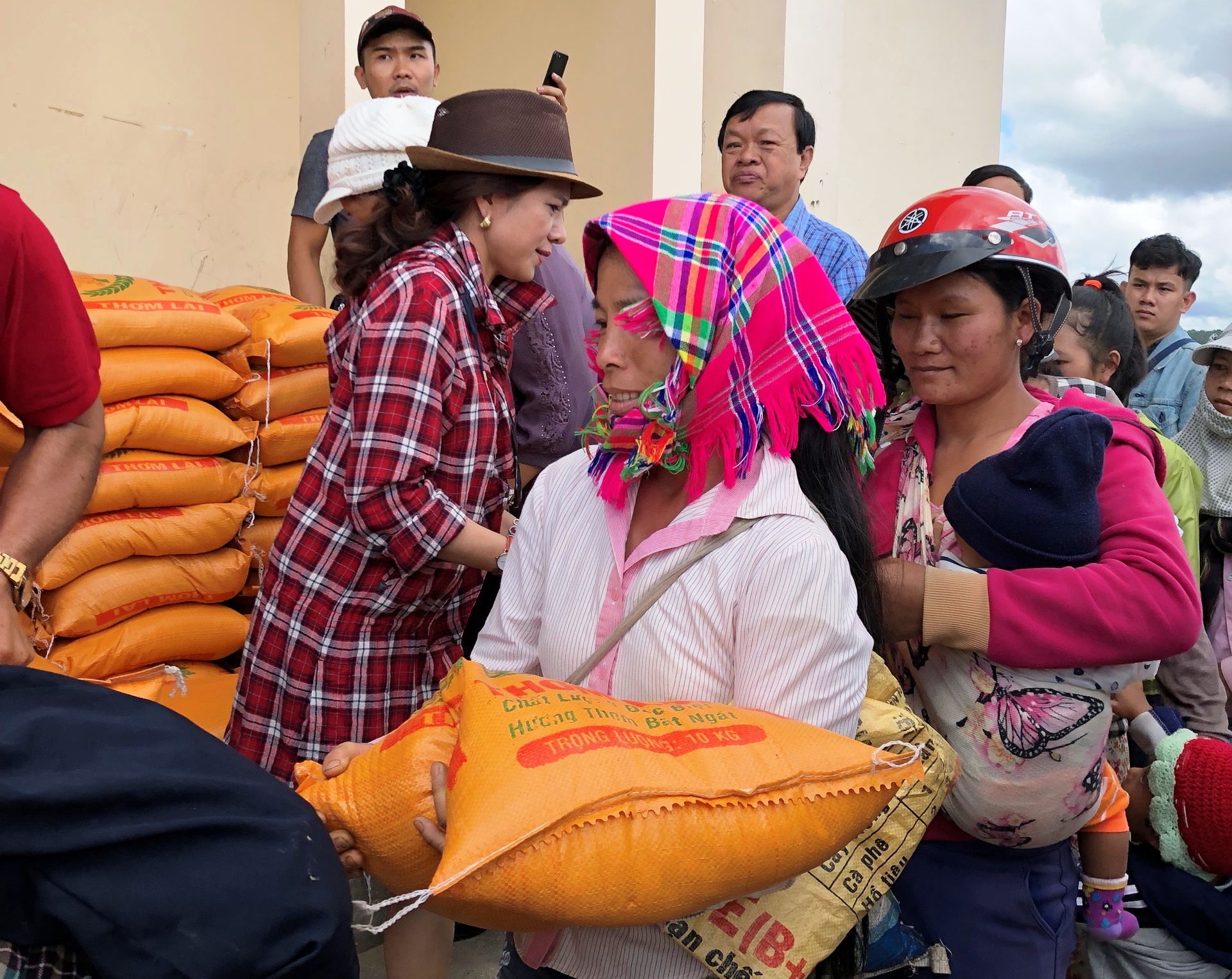 Các hộ dân nhận các phần quà từ đoàn thiện nguyện tỉnh Đồng Nai.