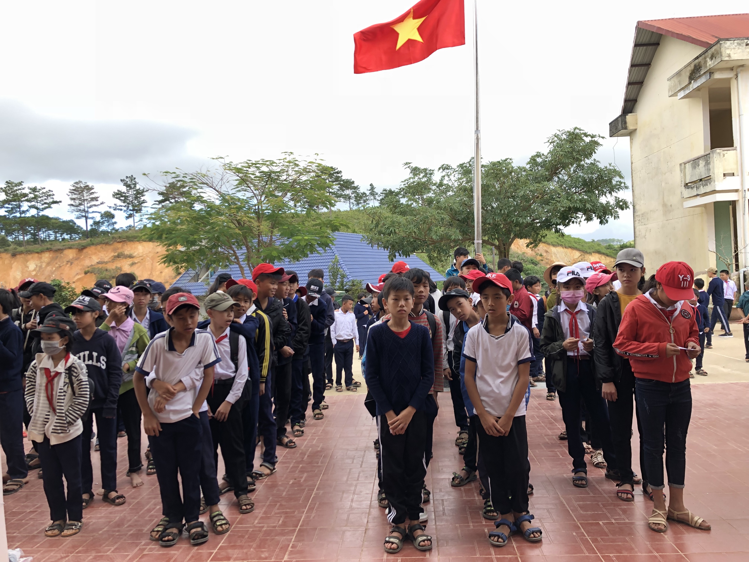 Các em học sinh 2 trường tiểu học và PTCS Phi Liêng đến nhận quà.