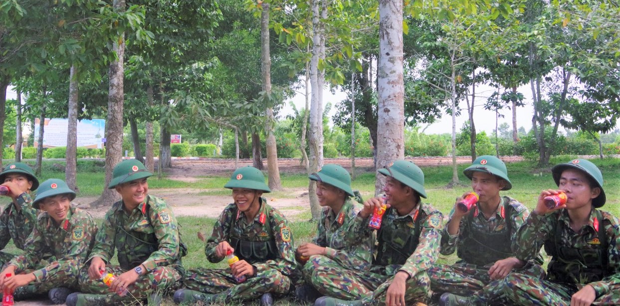 Niềm vui của các chiến sĩ khi được uống nước Dr. Thanh trên thao trường trong giờ nghỉ giải lao.