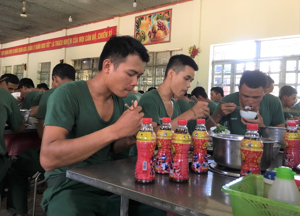Những chai nước mát Dr. Thanh được đặt sẵn trên bàn ăn của chiến sĩ.