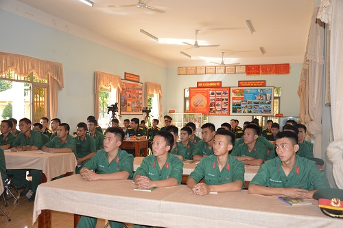 Các chiến sĩ Tiểu đoàn 3 tập trung lắng nghe Chính ủy Quân khu trao đổi.