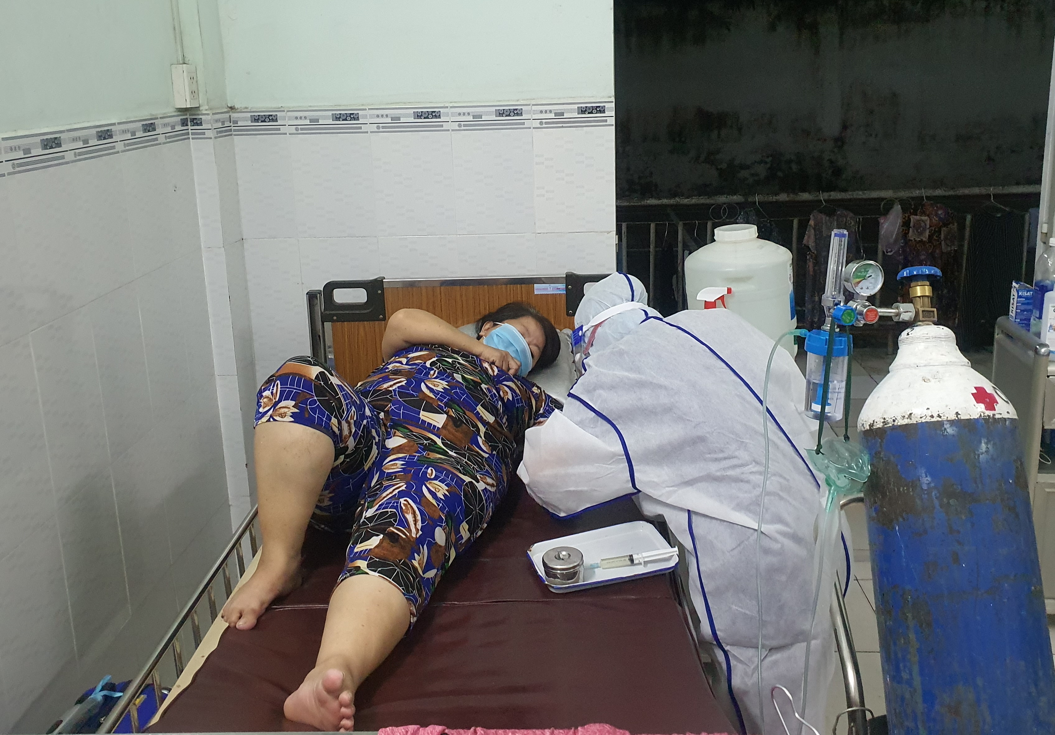 Tiêm thuốc kháng sinh cho bệnh nhân nặng phải thở qua mặt nạ oxy
