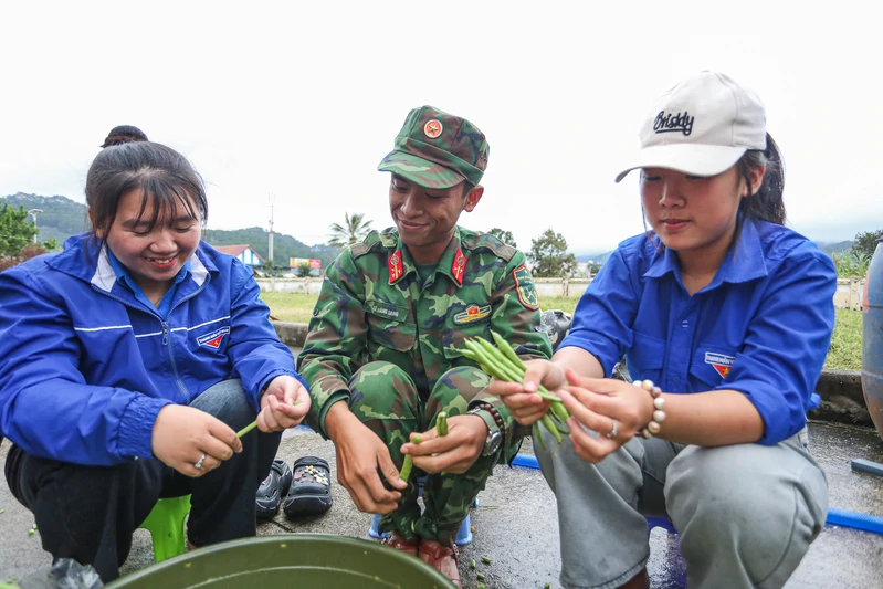 Đoàn viên Đoàn trường THPT Hùng Vương cùng chiến sĩ hậu cần Sư đoàn 302 sơ chế rau củ.