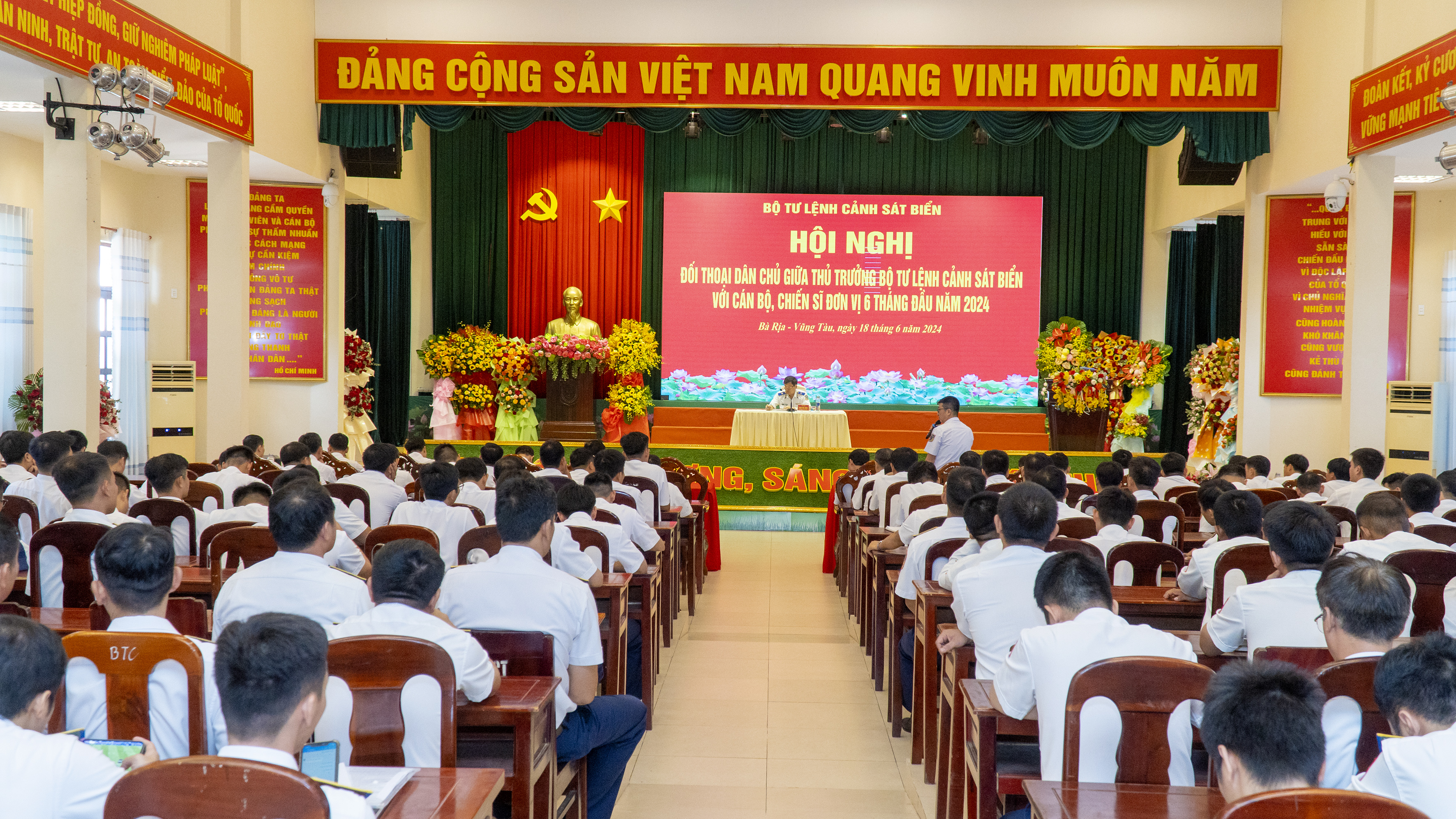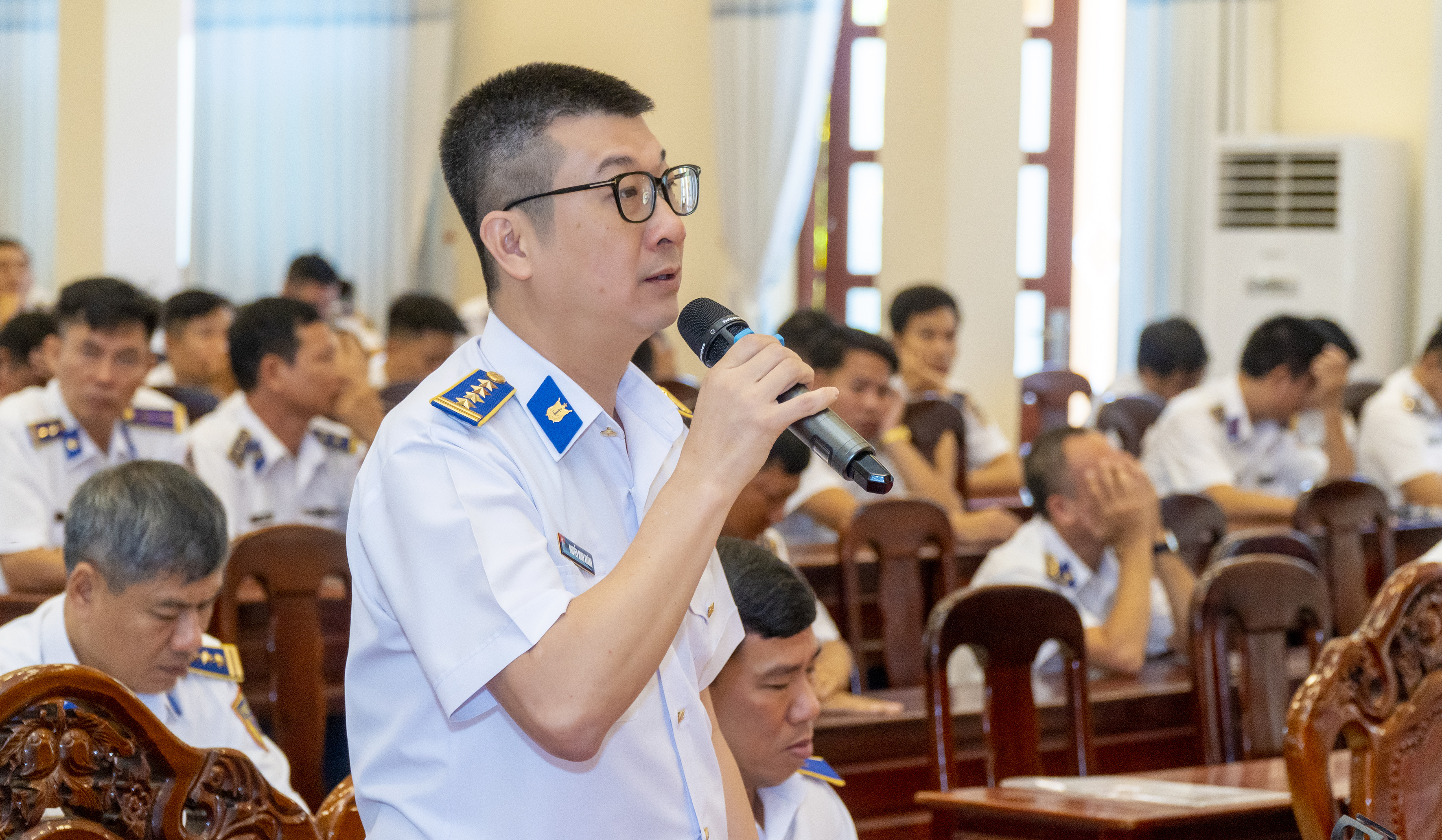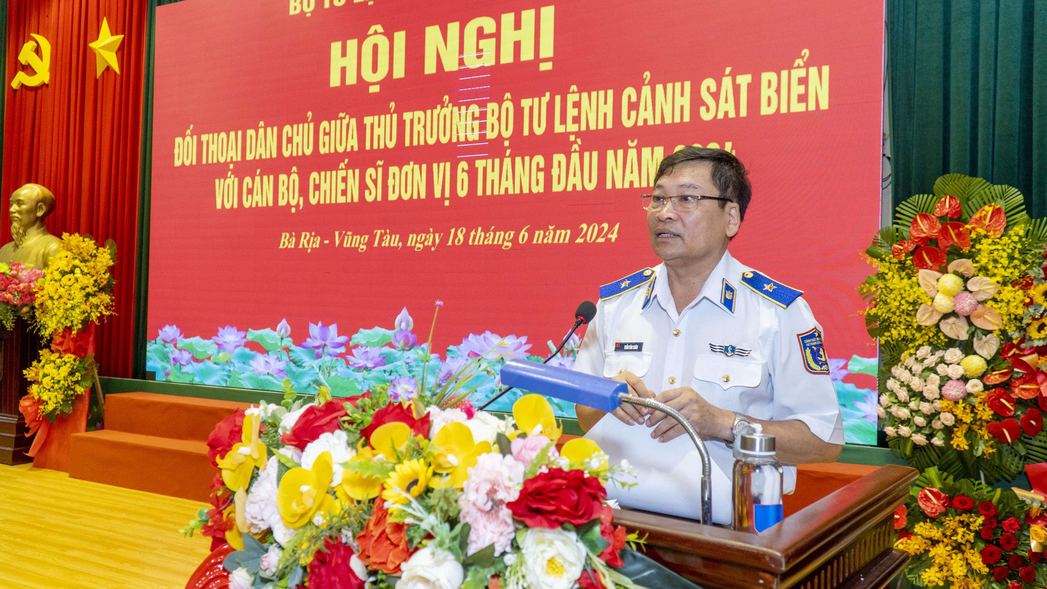 Đại tá Nguyễn Minh Khánh, Phó Tư lệnh, Tham mưu trưởng, Bộ Tư lệnh Vùng Cảnh sát biển 3 phát biểu ý kiến đóng góp về việc thực hiện QCDC ở cơ sở.