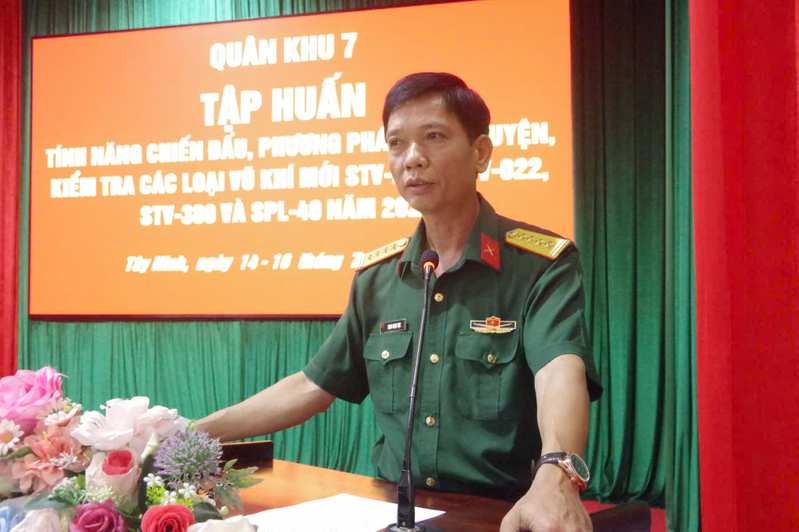 Đại tá Trịnh Ngọc Dục, Phó Chủ nhiệm Hậu cần - Kỹ thuật Quân khu phát biểu chỉ đạo lớp tập huấn các loại vũ khí mới năm 2025.