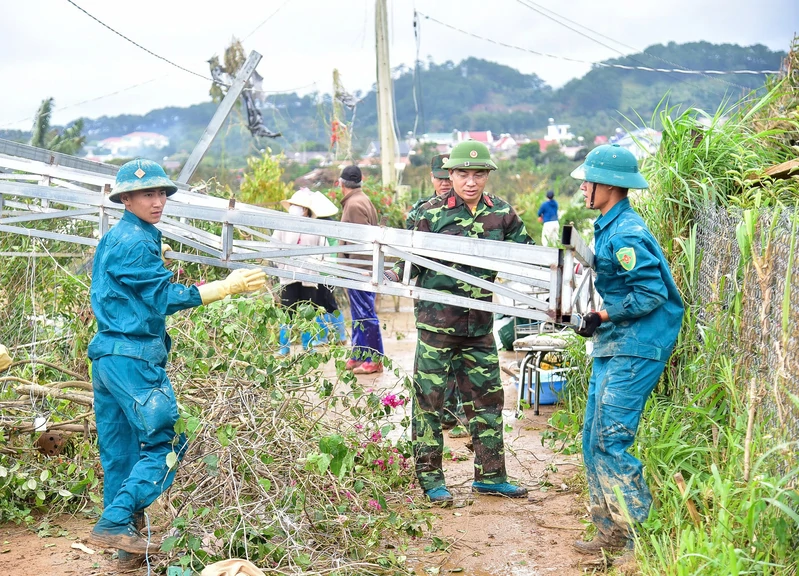 Lực lượng dân quân Bộ CHQS tỉnh Lâm Đồng giúp dân khắc phục hậu quả mưa lũ tại xã D'Ran năm 2025. Ảnh: Bạch Thiết