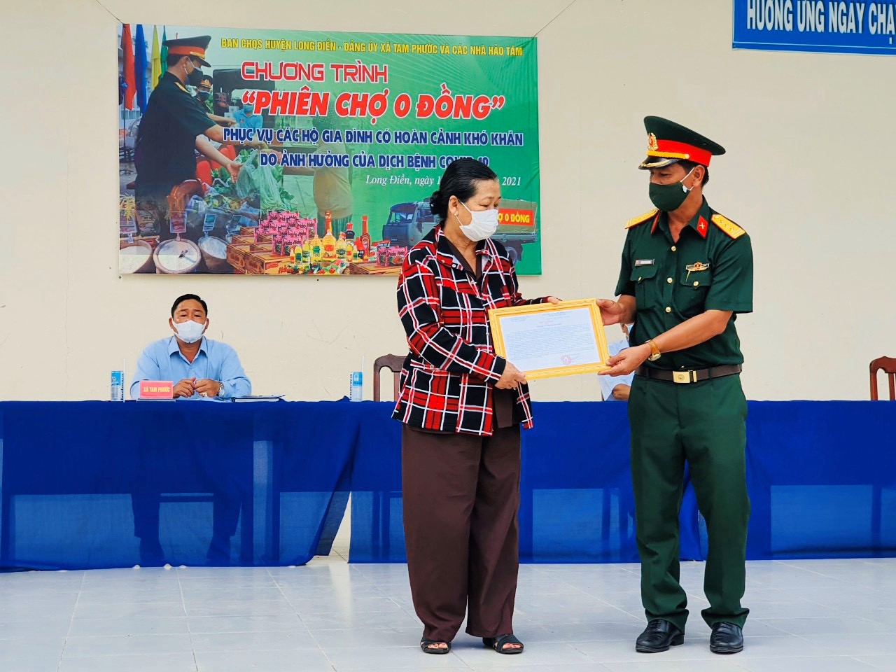 Thượng tá Huỳnh Văn Hùng, Chính trị viên Ban CHQS huyện Long Điền cho biết: “Trong lúc dịch bệnh bùng phát, nhiều người dân lâm vào cảnh khó khăn do mất việc làm, không có thu nhập. Thông qua “Phiên chợ 0 đồng” phần nào giúp đỡ những hoàn cảnh khó khăn, đồng thời chia sẻ yêu thương, thể hiện tinh thần “nhường cơm sẻ áo” để người dân vượt qua khó khăn cùng chung sức, đồng lòng vượt qua đại dịch”.