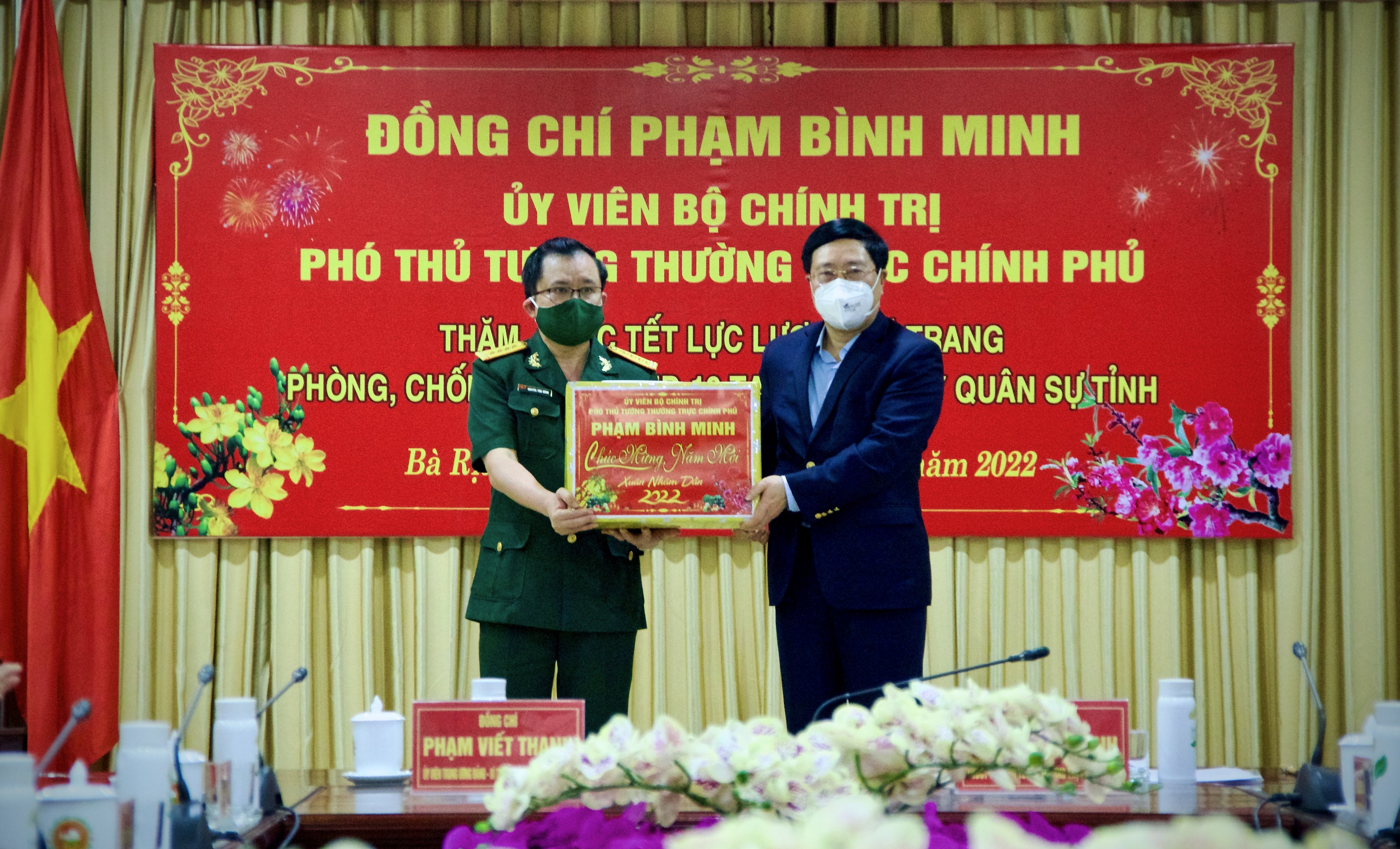 Thăm, chúc tết cán bộ, chiến sĩ Bộ CHQS tỉnh Bà Rịa-Vũng Tàu, Phó Thủ tướng Phạm Bình Minh cho biết, Bà Rịa-Vũng Tàu là địa bàn đặt nhiều cơ sở quốc phòng, kinh tế trọng yếu của đất nước. Những năm qua, LLVT tỉnh được giao nhiệm vụ và đã bảo vệ rất tốt những cơ sở trọng yếu này, đồng thời phối hợp với các lực lượng bảo vệ an toàn biên giới, biển đảo, chủ quyền quốc gia. Bên cạnh đó, Bộ CHQS tỉnh cử lực lượng tham gia tích cực vào công tác phòng, chống dịch Covid-19 tại địa phương, tham mưu lập các cơ sở cách ly, điều trị và hỗ trợ, chăm sóc người dân trước, trong và sau dịch. Phó Thủ tướng lưu ý lãnh đạo Bộ CHQS tỉnh cần bố trí, sắp xếp lực lượng trực sẵn sàng chiến đấu hợp lý, đảm bảo an toàn cho Nhân dân đón tết Nguyên đán, đồng thời, quan tâm, chăm lo đời sống vật chất, tinh thần cho cán bộ, chiến sĩ để đảm bảo thực hiện tốt nhiệm vụ.