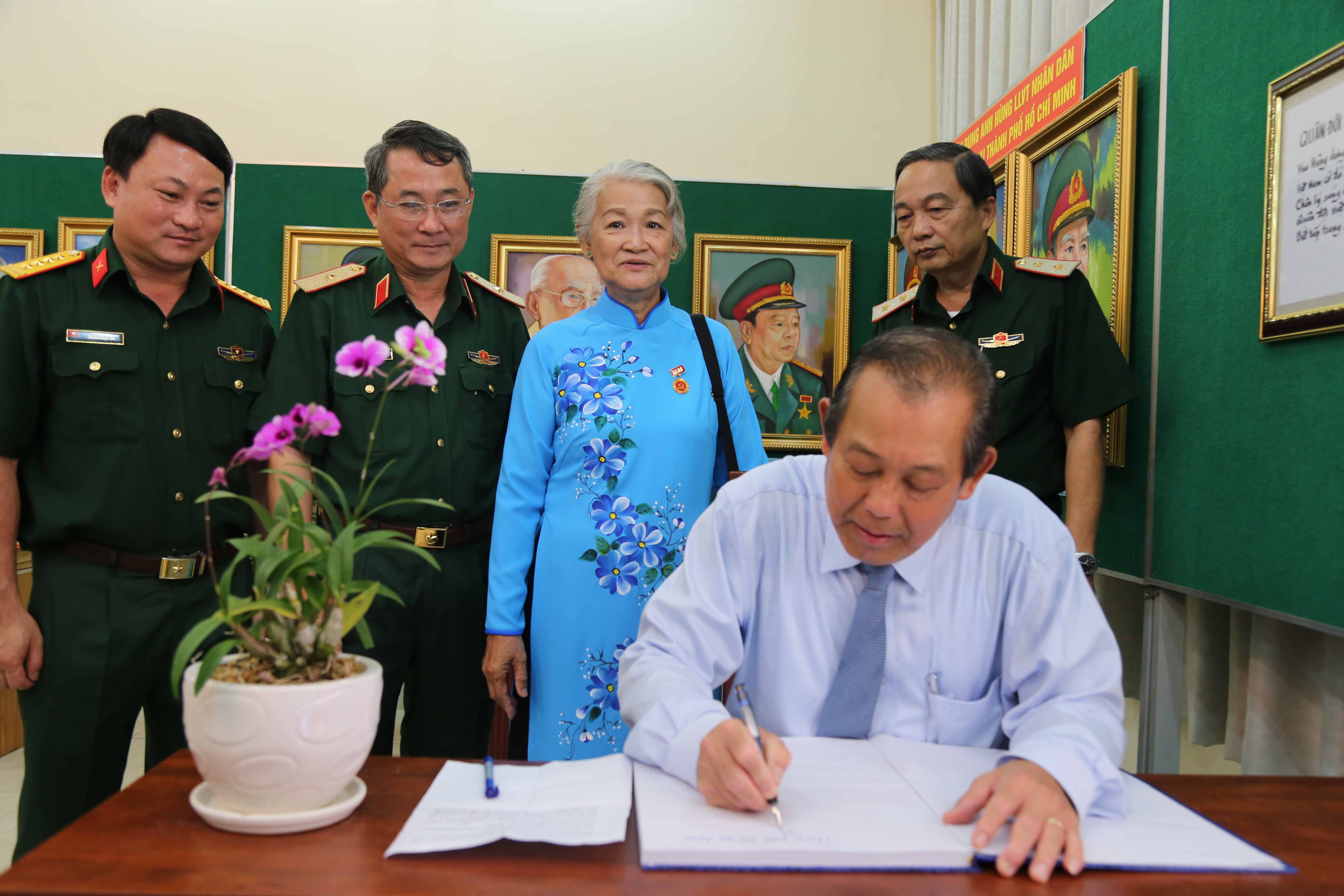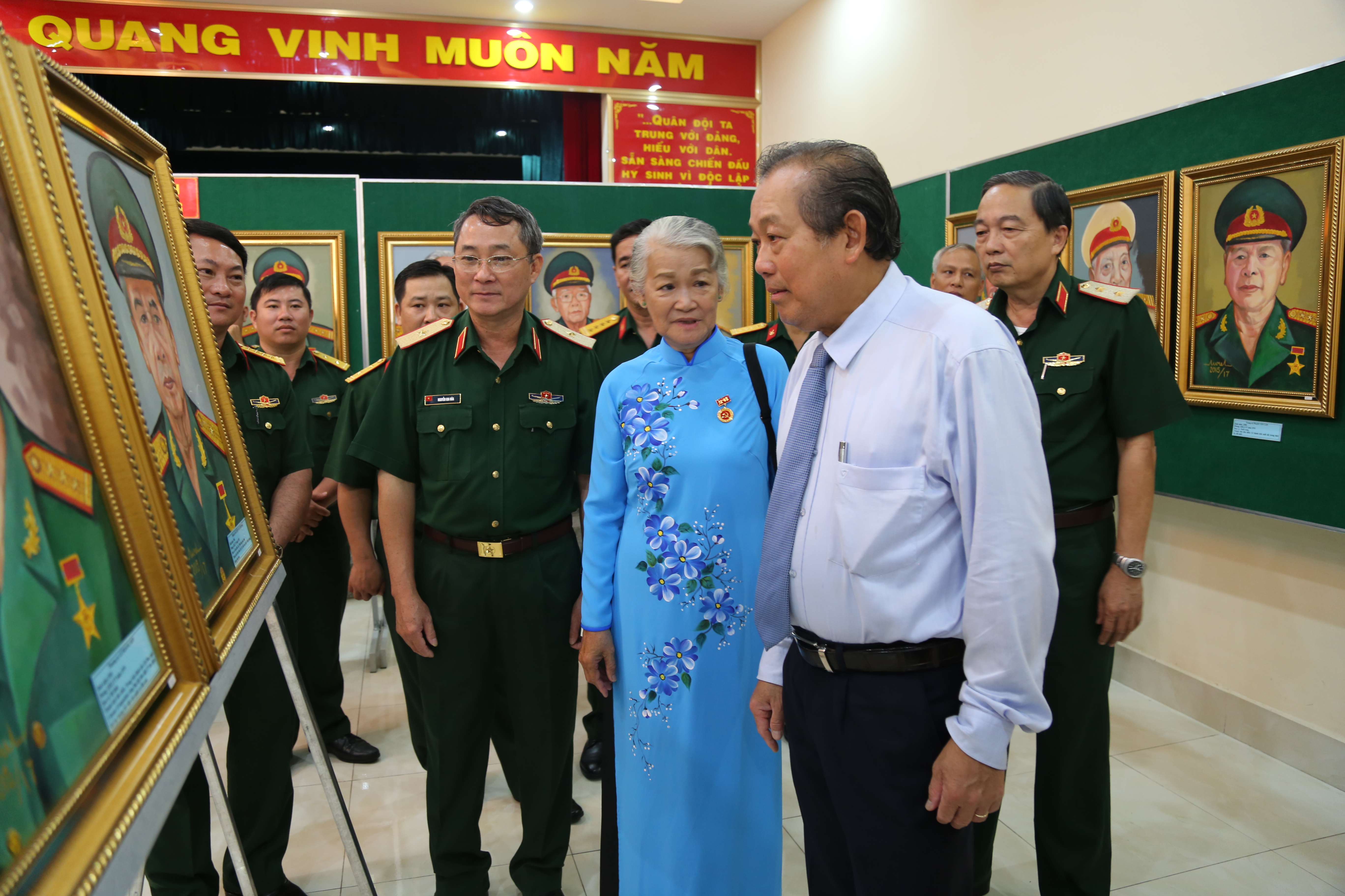 Đồng chí Trương Hòa Bình - Ủy viên Bộ Chính trị, Phó Thủ tướng Thường trực Chính phủ; Trung tướng Phạm Văn Dỹ - Chính ủy Quân khu 7; Thiếu tướng Nguyễn Gia Hòa - Chủ nhiệm chính trị Quân khu 7 và họa sĩ Đặng Ái Việt tại triển lãm