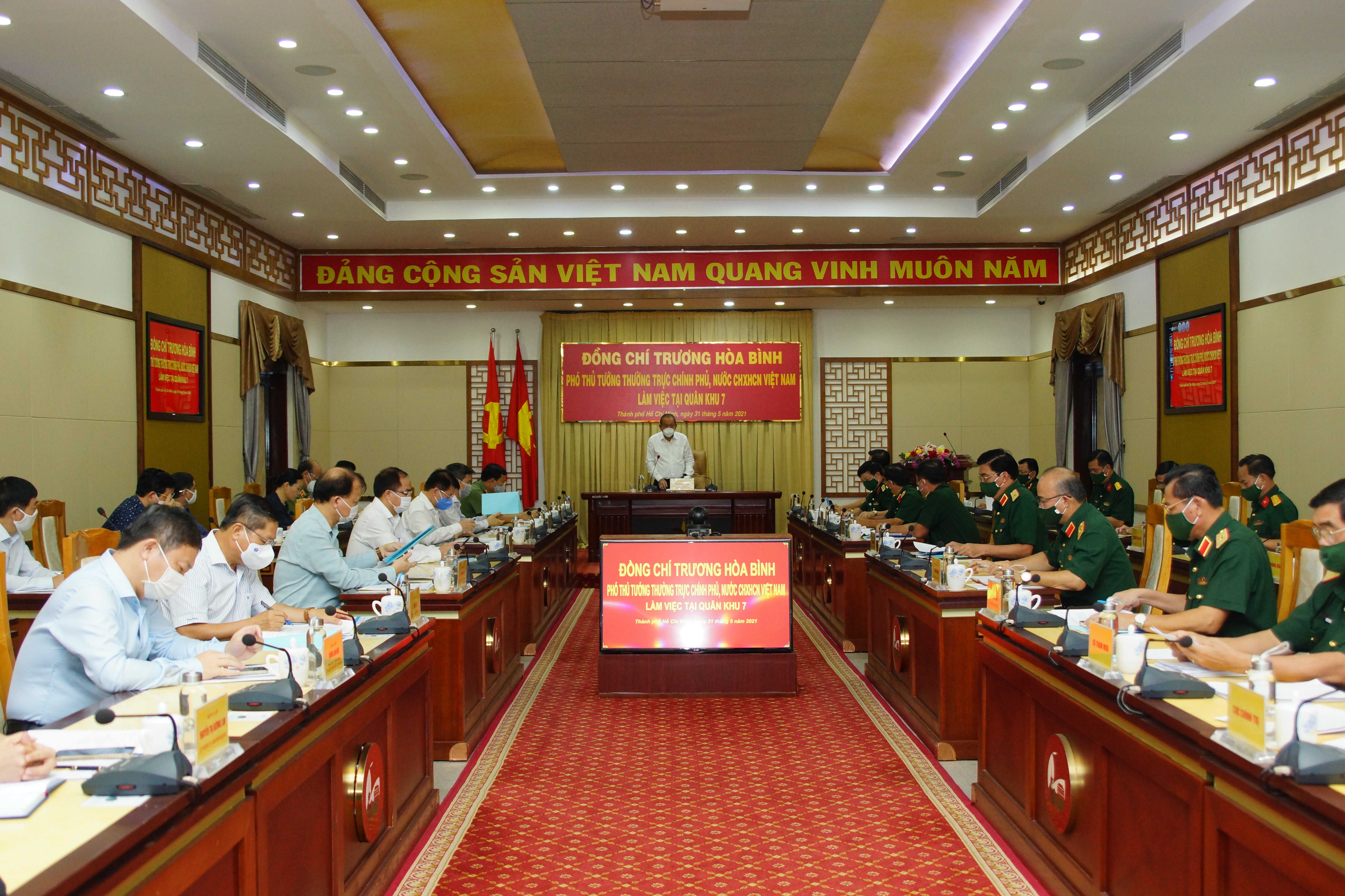 Đồng chí Trương Hòa Bình đánh giá cao công tác phòng, chống dịch bệnh của Quân khu 7 cũng như tinh thần nỗ lực, trách nhiệm của cán bộ, chiến sĩ trong thực hiện nhiệm vụ phòng, chống dịch bệnh vừa qua. Đồng chí Phó Thủ tướng thường trực yêu cầu, Quân khu 7 là địa bàn trọng yếu, đầu tàu kinh tế của cả nước, vừa có biên giới, vừa có nhiều khu chế xuất, khu công nghiệp với số lượng công nhân rất lớn.