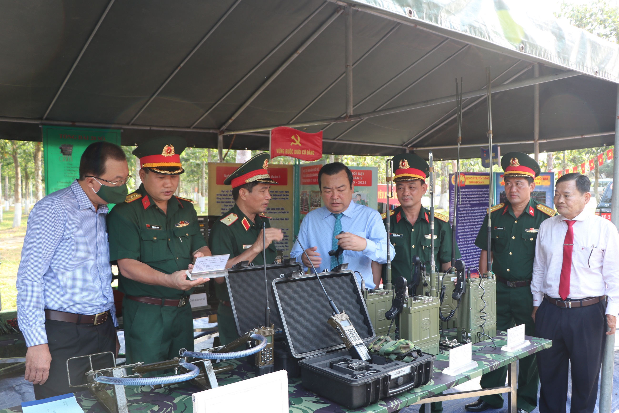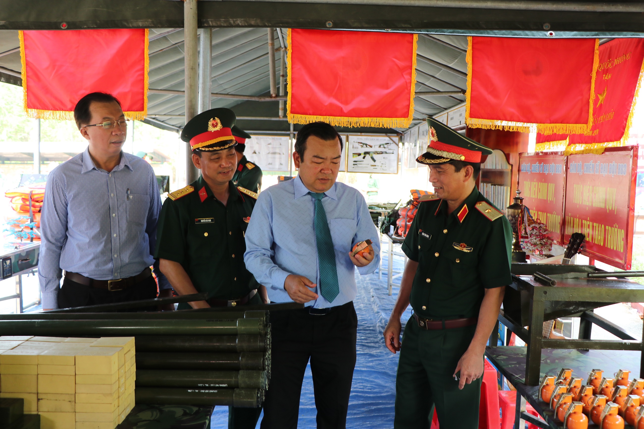 Các đồng chí lãnh đạo tham quan trưng bày các mô hình học cụ phục vụ công tác huấn luyện.