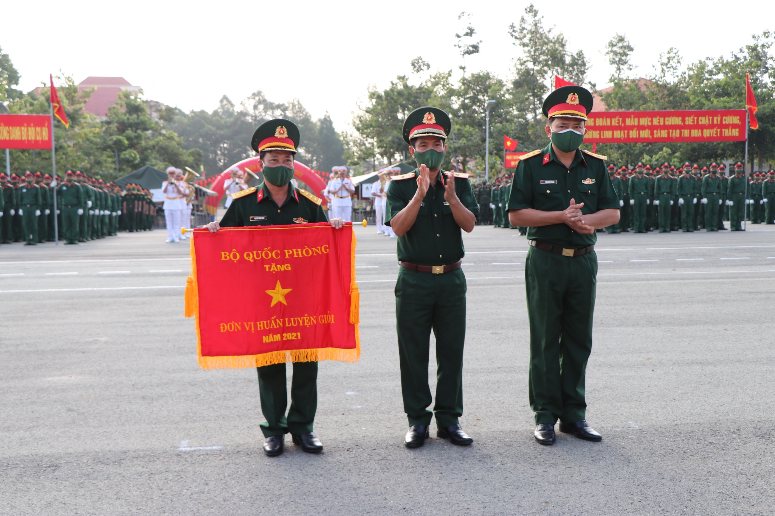 Thiếu tướng Đặng Văn Hùng, Phó Tư lệnh, Tham mưu trưởng Quân khu trao Cờ của Bộ Quốc phòng công nhận đơn vị huấn luyện giỏi năm 2021 cho Trung đoàn 5.