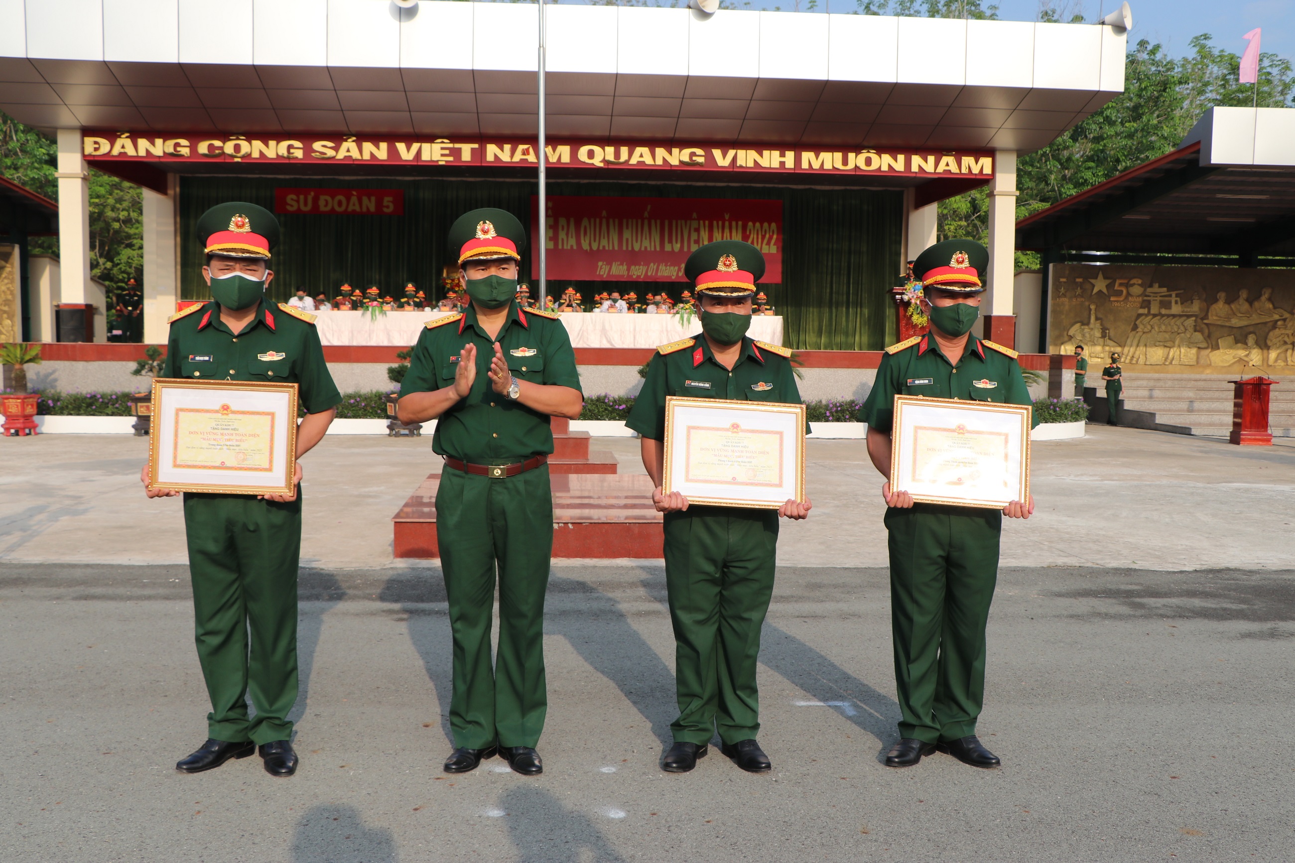 Đại tá Phạm Anh Tuấn, Chính ủy Sư đoàn 5 tặng danh hiệu Đơn vị vững mạnh toàn diện "Mẫu mực tiêu biểu" năm 2021 của Bộ Tư lệnh Quân khu cho các tập thể của Sư đoàn.