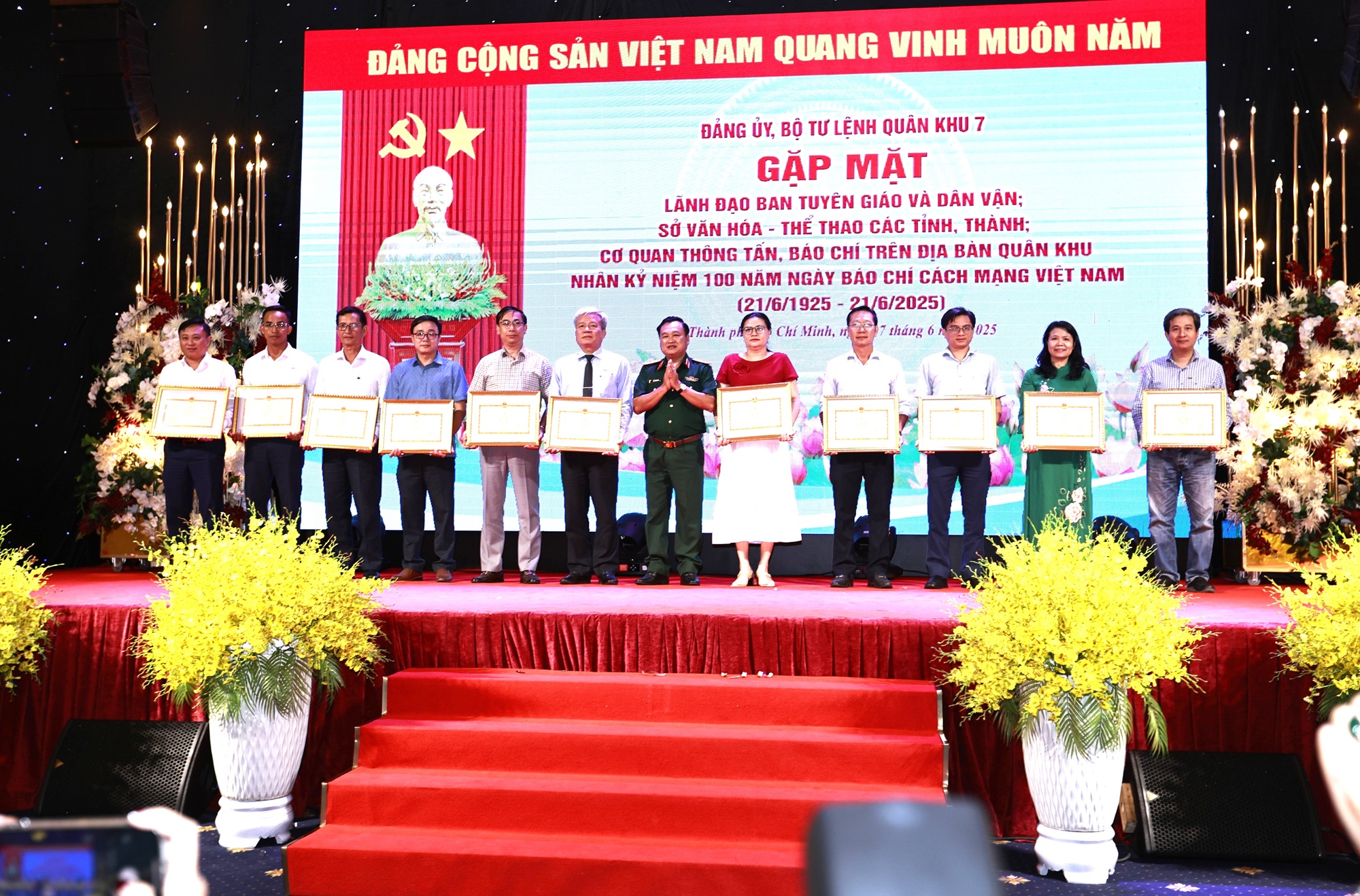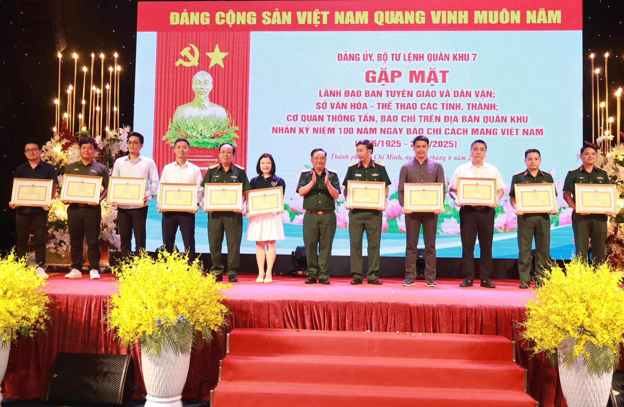 Thiếu tướng Trần Vinh Ngọc, Bí thư Đảng ủy, Chính ủy Quân khu trao bằng khen của Bộ Tư lệnh Quân khu cho các tập thể xuất sắc trong công tác phối hợp tuyên truyền hoạt động của LLVT Quân khu năm 2024 và 6 tháng đầu năm 2025 (Ảnh Lê Trầm).