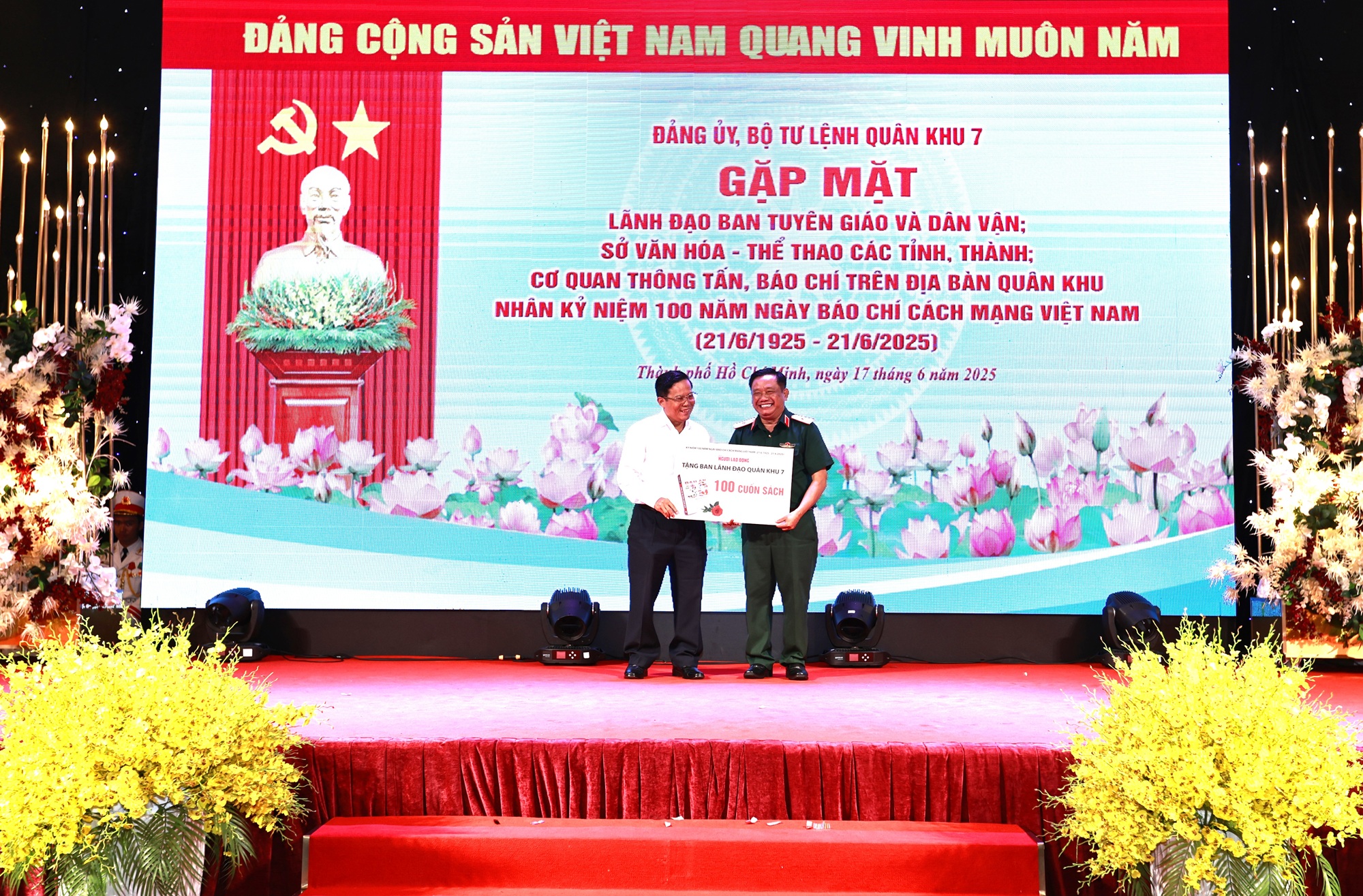 Thiếu tướng Trần Chí Tâm, Phó Chính ủy Quân khu trao bằng khen của Bộ Tư lệnh Quân khu cho các cá nhân xuất sắc trong công tác phối hợp tuyên truyền hoạt động của LLVT Quân khu năm 2024 và 6 tháng đầu năm 2025 (Ảnh Hằng Ny). Đồng chí Tô Đình Tuân, Tổng biên tập Báo Người Lao động tặng sách cho Thủ trưởng Bộ Tư lệnh Quân khu (Ảnh Lê Trầm).