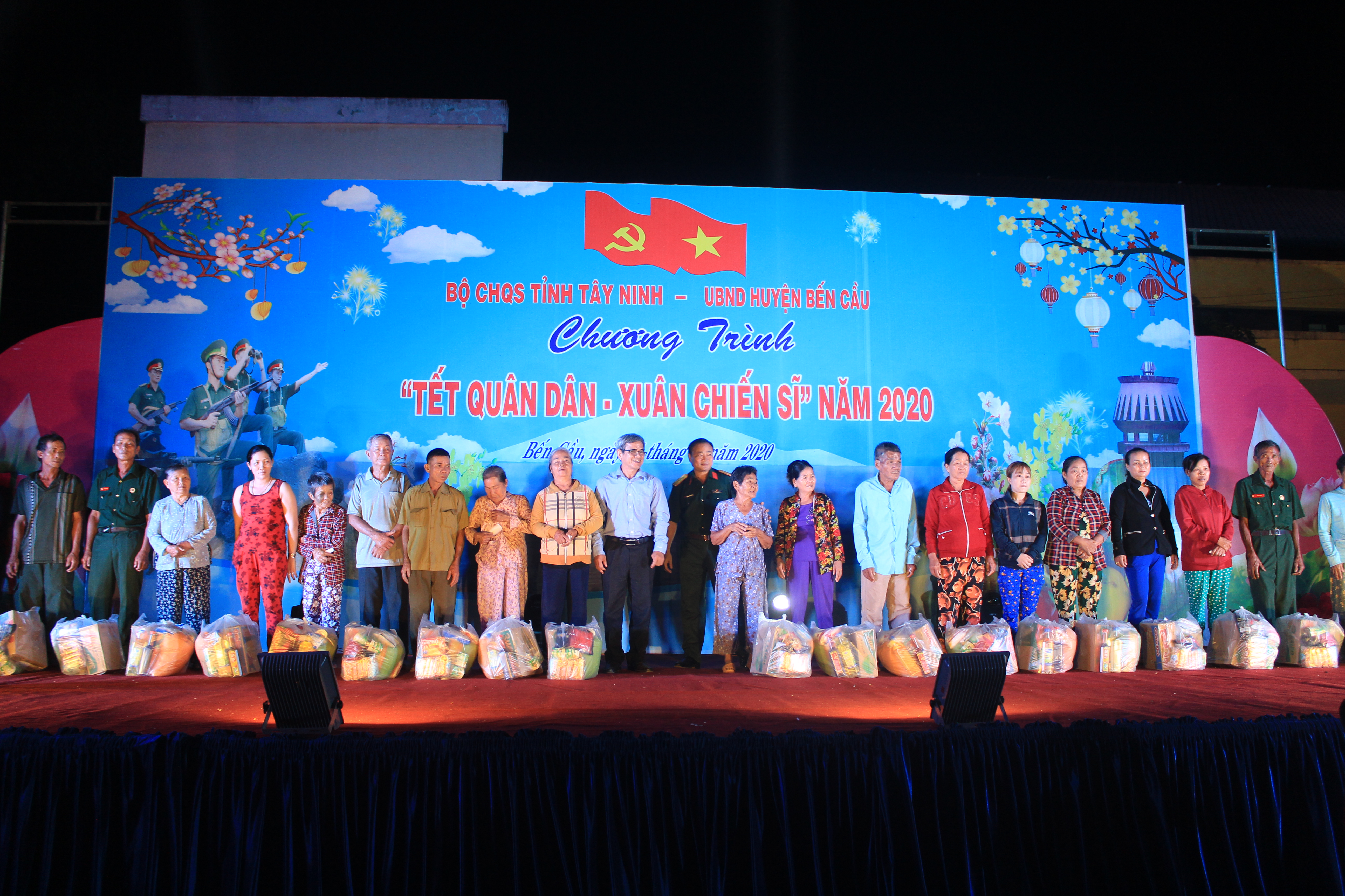 Bộ CHQS tỉnh phối hợp tặng 90 phần quà cho Mẹ VNAH, thương - bệnh binh nặng, các đơn vị đang công tác trên tuyến biên giới thuộc huyện Bến Cầu, cán bộ, chiến sỹ, dân quân, chiến sĩ Biên phòng, đối tượng chính sách, nhân dân có hoàn cảnh đặc biệt khó khăn trên địa bàn huyện.
