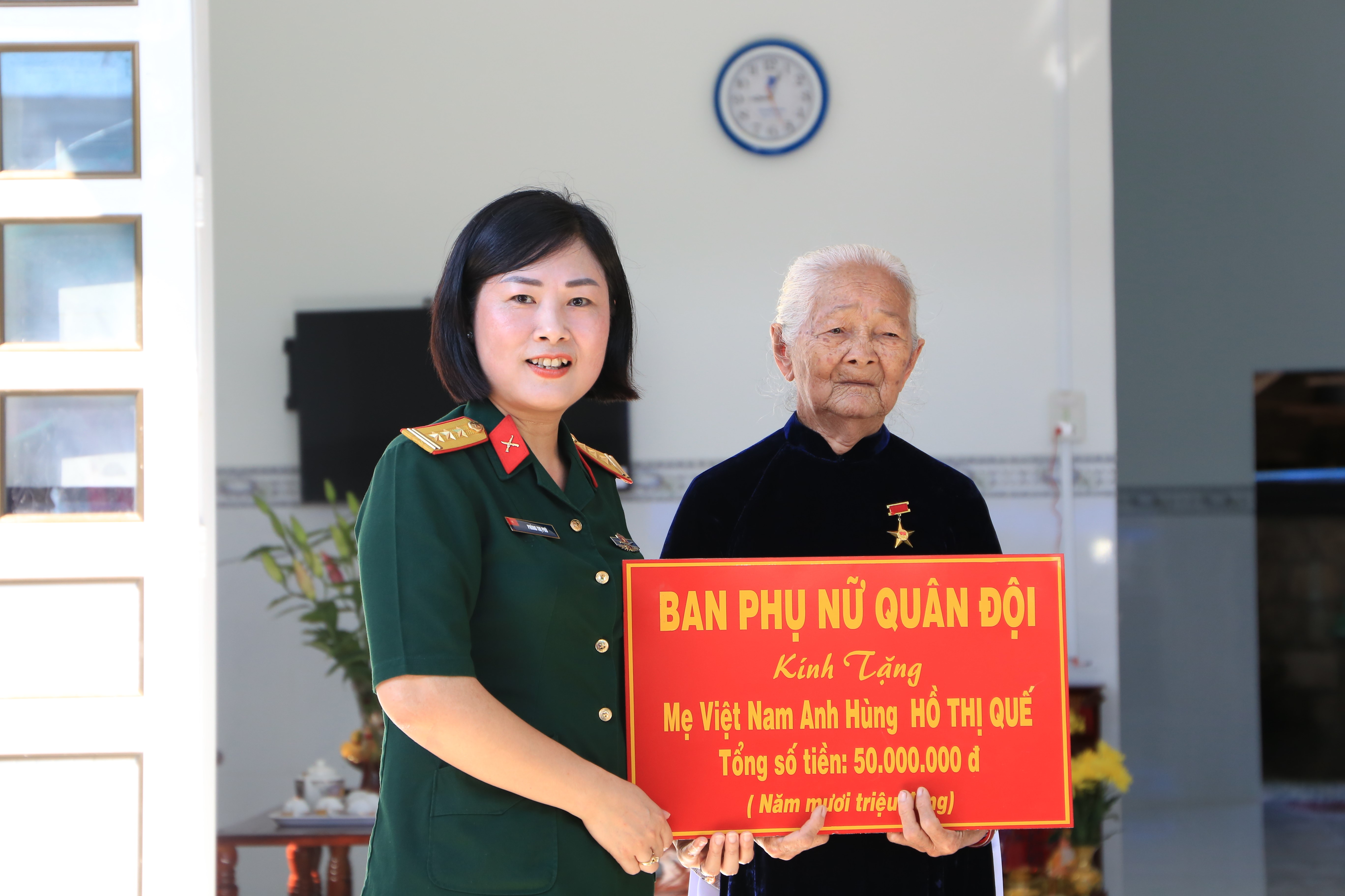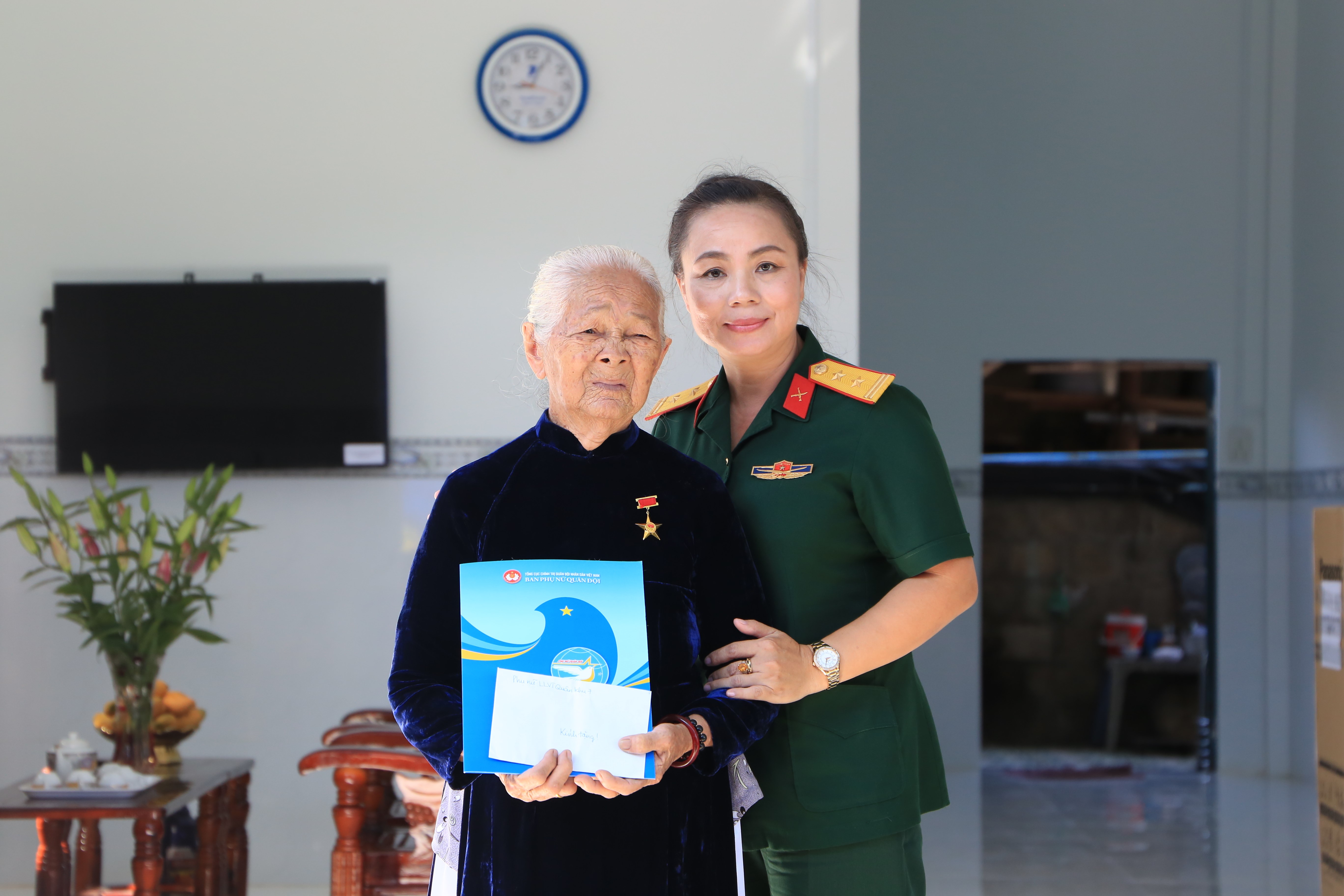 Đại diện Ban phụ nữ Quân khu 7 tặng quà Mẹ VNAH Hồ Thị Quế.
