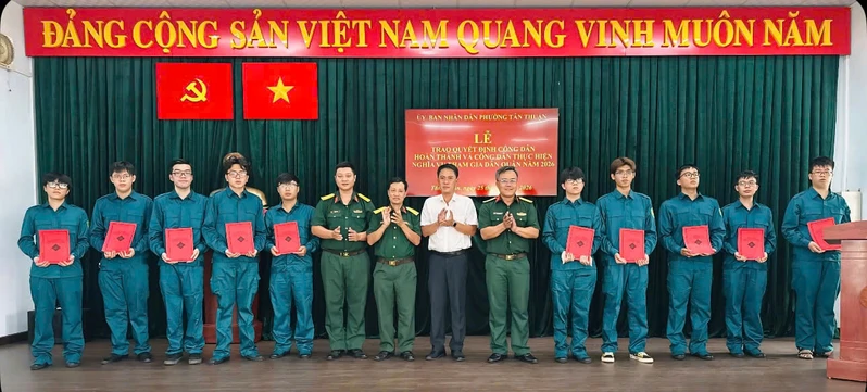 (QK7 Online) - Ngày 25/4, Ban CHQS phường Tân Thuận, Bộ Tư lệnh Thành phố Hồ Chí Minh tổ chức Lễ trao quyết định công dân hoàn thành và công dân thực hiện nghĩa vụ tham gia dân quân năm 2026. Tham dự buổi lễ có đại diện Ban Dân quân Tự vệ, Bộ Tư lệnh TP.Hồ Chí Minh; Ban Chỉ huy Phòng thủ khu vực 4 - Nhà Bè, Bộ Tư lệnh TP.Hồ Chí Minh; Thường trực Đảng ủy, UBND phường Tân Thuận.
