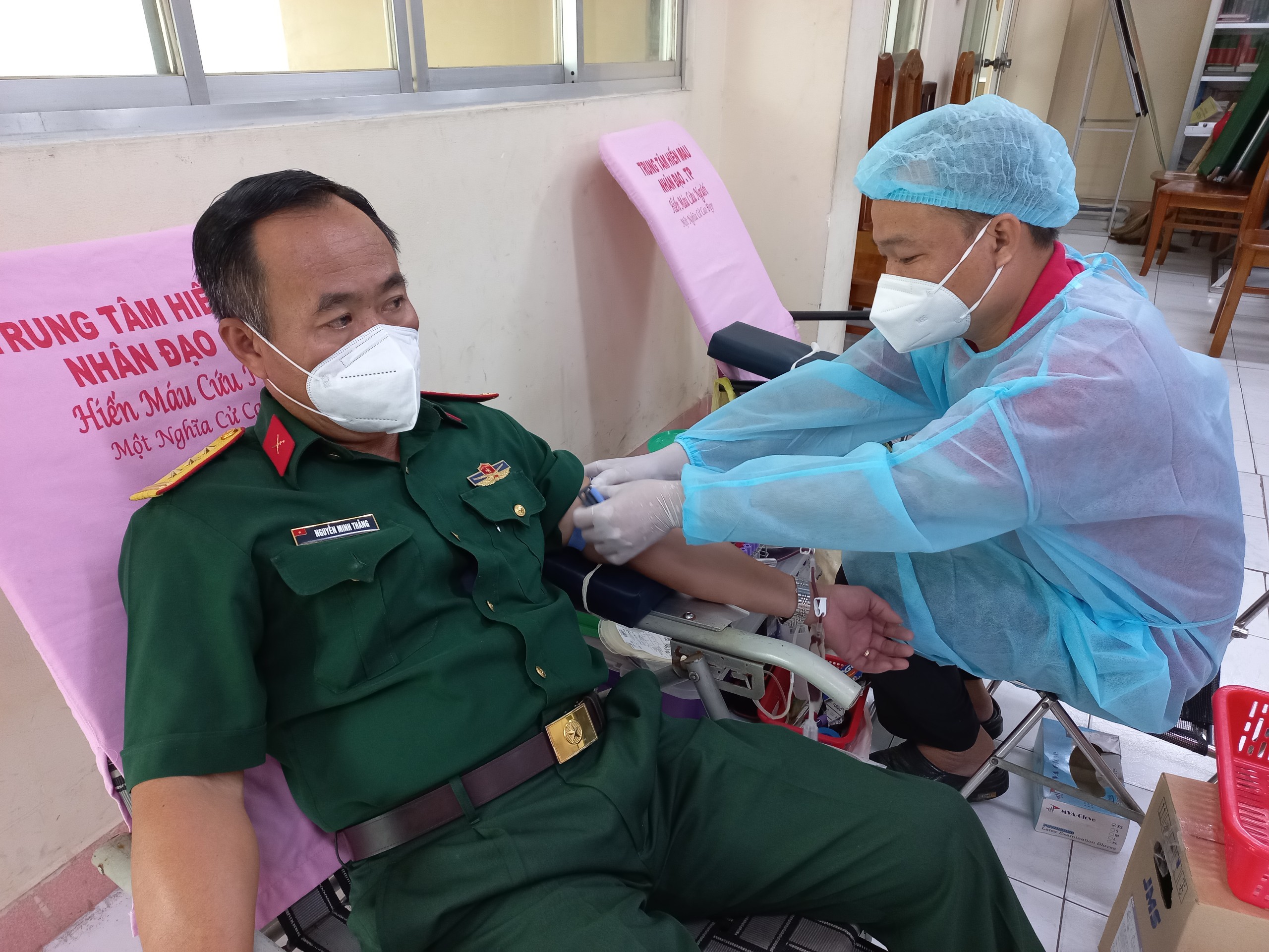 Thượng tá Nguyễn Minh Thắng, Chỉ huy trưởng Ban CHQS quận tham gia hiến máu nhân đạo.
