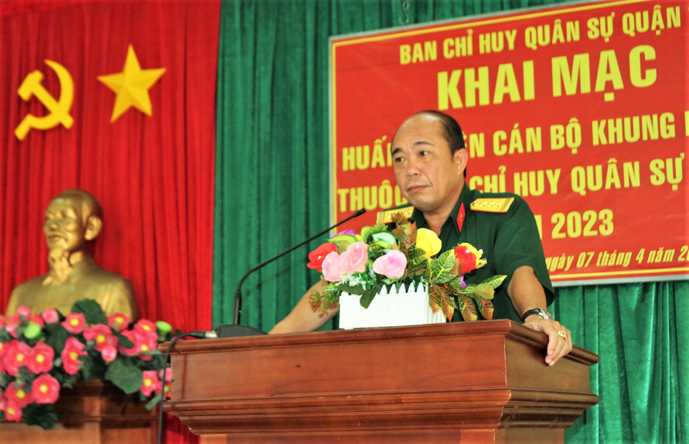 (QK7 Online) - Sáng 7/4, tại Trung đoàn 10, Bộ Tư lệnh TPHCM, Ban Chỉ huy Quân sự quận 1 tổ chức khai mạc huấn luyện cán bộ khung B quân nhân dự bị thuộc Tiểu đoàn Bộ binh quận năm 2023. Dự, phát biểu chỉ đạo có Thượng tá Tăng Văn Hùng, Phó Tham mưu trưởng Bộ Tư lệnh TPHCM.