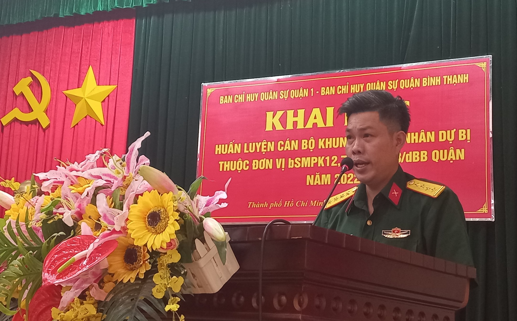 Phát biểu khai mạc, Thượng tá Huỳnh Văn Thương, Chính trị viên Ban Chỉ huy Quân sự Quận 1 đề nghị đội ngũ cán bộ khung huấn luyện nêu cao vai trò, trách nhiệm, thực hiện tốt công tác quản lý chỉ huy, duy trì nền nếp chế độ, duy trì thời gian học tập đúng nội dung, chương trình đề ra. Đồng thời, yêu cầu từng quân nhân dự bị khắc phục khó khăn về hoàn cảnh gia đình, công việc, thời tiết, chấp hành nghiêm nền nếp, chế độ, tham gia học tập bảo đảm quân số, nội dung, thời gian, kết thúc khóa huấn luyện, kiểm tra đạt kết quả khá trở lên. Tích cực nghiên cứu, trao đổi, luyện tập với tinh thần tự giác, quyết tâm phấn đấu nắm chắc nội dung để làm cơ sở về tập huấn, huấn luyện cho cơ quan, đơn vị mình đạt kết quả cao nhất.