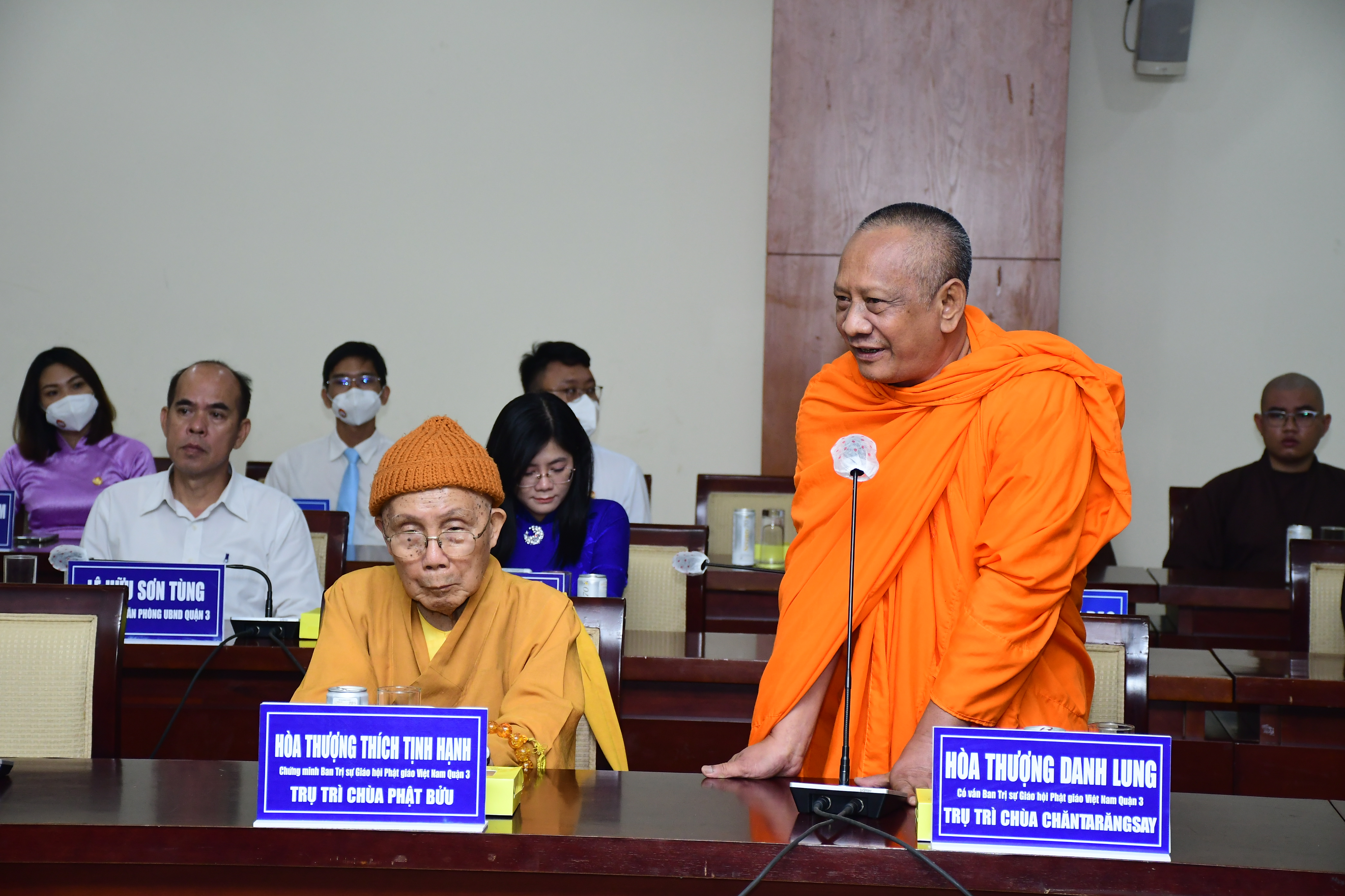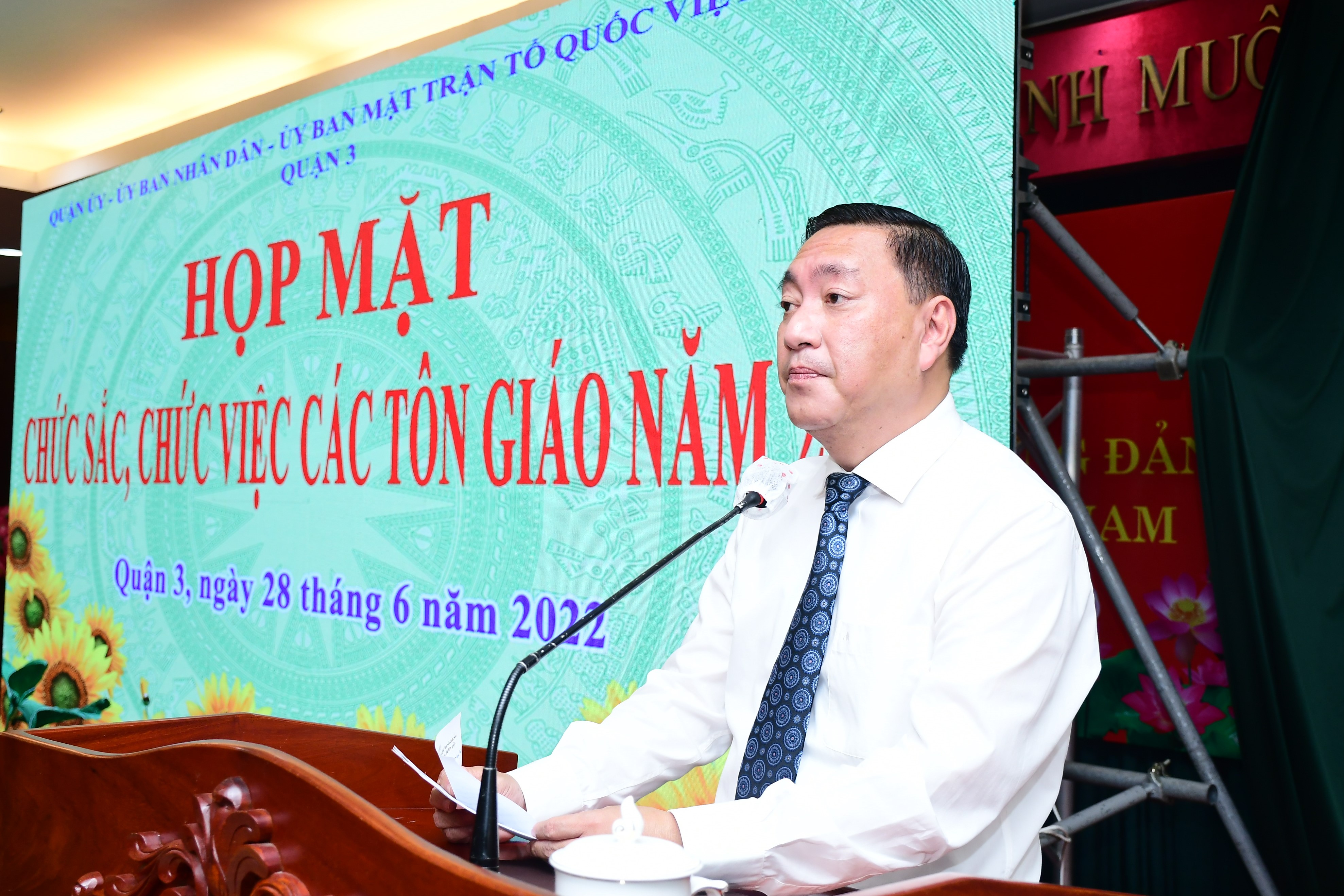 Phát biểu tại buổi họp mặt, đồng chí Phạm Thành Kiên, Bí thư Quận ủy Quận 3 cho biết: Địa bàn Quận 3 có 92 cơ sở tôn giáo đang hoạt động và là nơi tập trung các cơ sở tôn giáo lớn của Trung ương, thành phố. Nhiều năm qua, công tác tôn giáo luôn được Quận ủy lãnh đạo thường xuyên, kịp thời chỉ đạo UBND, Ủy ban MTTQVN quận, các ban, ngành, đoàn thể chính trị - xã hội quận giữ mối liên hệ gắn bó với các cơ sở tôn giáo; động viên các chức sắc, chức việc và đồng bào theo đạo nêu cao tinh thần đoàn kết, gắn bó với cộng đồng, chấp hành pháp luật, tích cực tham gia phong trào thi đua, phong trào hành động cách mạng; kịp thời triển khai thực hiện tốt các chính sách an sinh xã hội, tham gia nhiều hoạt động có ý nghĩa như: “Tìm hiểu và học tập, làm theo tư tưởng, đạo đức, phong, cách Hồ Chí Minh trong giới tăng, ni Phật giáo Việt Nam Quận 3", Liên hoan văn nghệ “Tiếng hát đồng bào Công giáo Quận 3”; Tổ chức “Tiệc buffet chay” đóng góp ủng hộ quỹ “Vì người nghèo"; Mô hình “Cơ sở tôn giáo gắn với hộ nghèo, hộ cận nghèo”; tham gia đóng góp quỹ “Vì biển đảo quê hương, vì tuyến đầu Tổ quốc”, phong trào “Toàn dân bảo vệ an ninh Tổ quốc”....