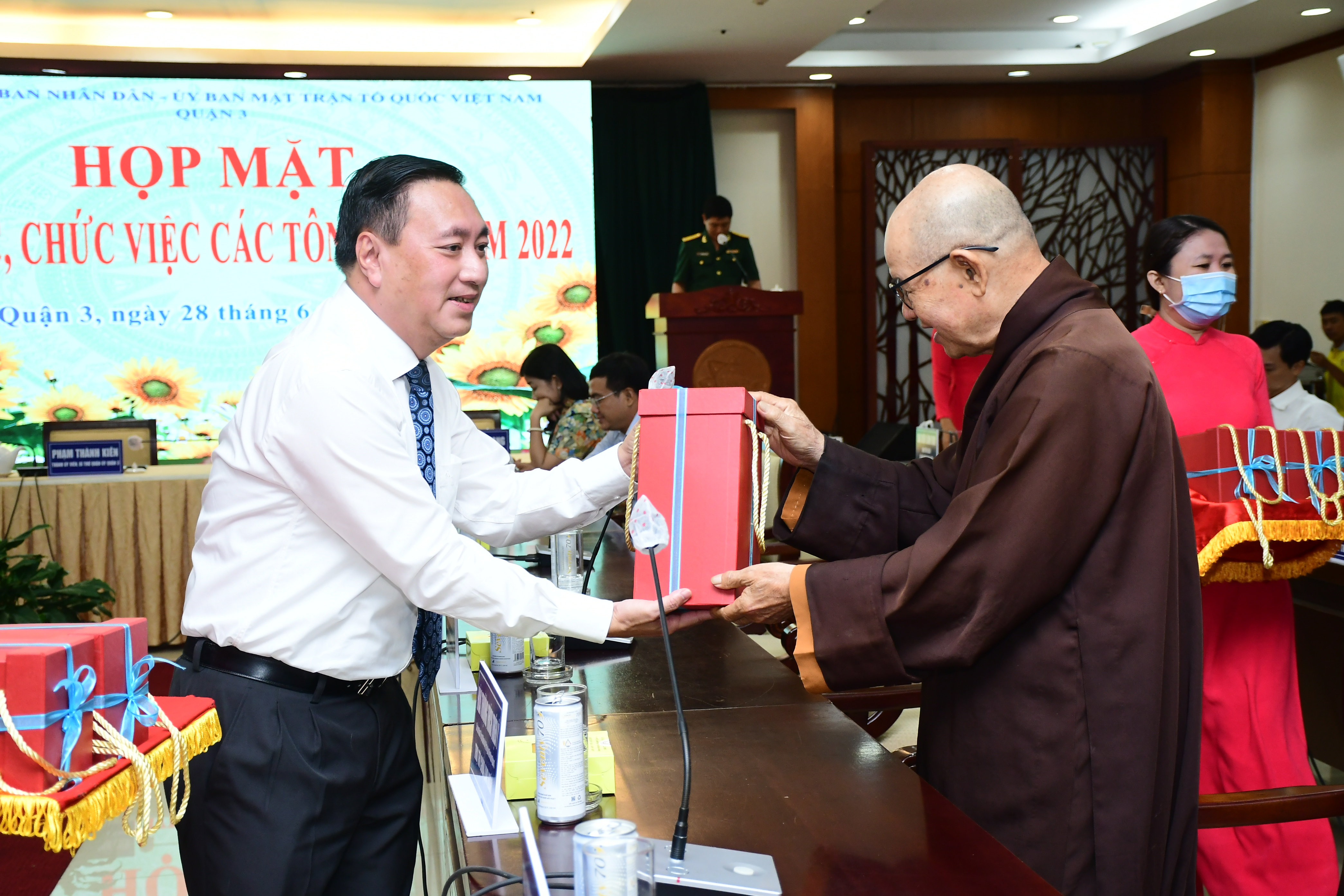Đồng chí Phạm Thành Kiên, Bí thư Quận ủy Quận 3 tặng quà các đại biểu tôn giáo dự họp mặt.