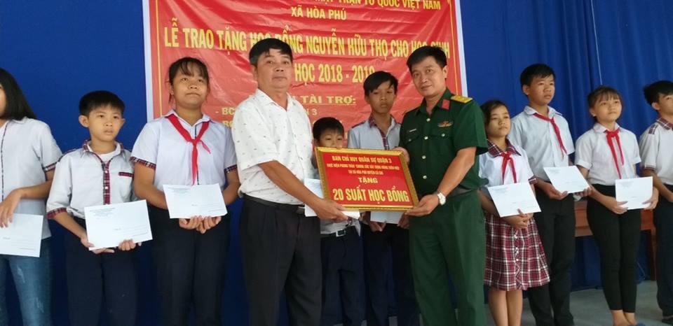Tại chương trình trao học bổng, Trung tá Nguyễn Ngọc Hùng, Chính trị viên phó Ban CHQS quận 3 thay mặt Đảng ủy-Ban CHQS quận 3 đã trao tặng 20 suất học bổng cho các em học sinh có hoàn cảnh khó khăn, vượt khó của xã Hòa Phú với mỗi suất trị giá 1 triệu đồng/xuất. Bên cạnh đó, hai đơn vị còn tổ chức các hoạt động giao lưu văn nghệ, thể dục thể thao tạo sân chơi cho các em.