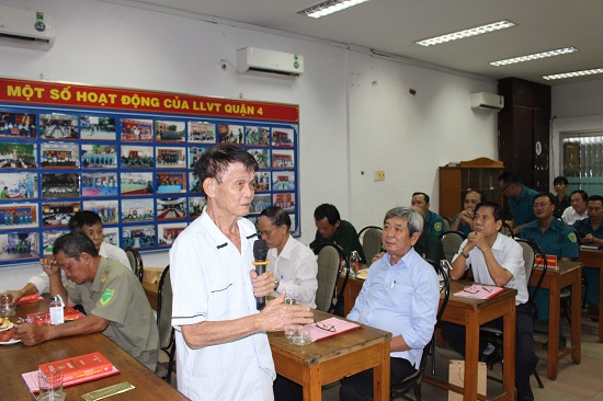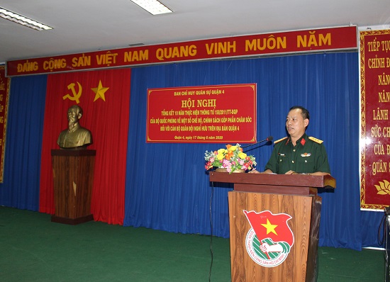 (QK7 Online) - Ngày 17/6, Ban CHQS Quận 4 tổ chức Hội nghị Tổng kết 10 năm thực hiện Thông tư 158/2011/TT-BQP ngày 15/8/2011 của Bộ Quốc phòng về “Thực hiện một số chế độ, chính sách góp phần chăm sóc đối với cán bộ quân đội nghỉ hưu”. Thượng tá Vũ Trọng Khanh, Chính trị Ban CHQS Quận chủ trì hội nghị.