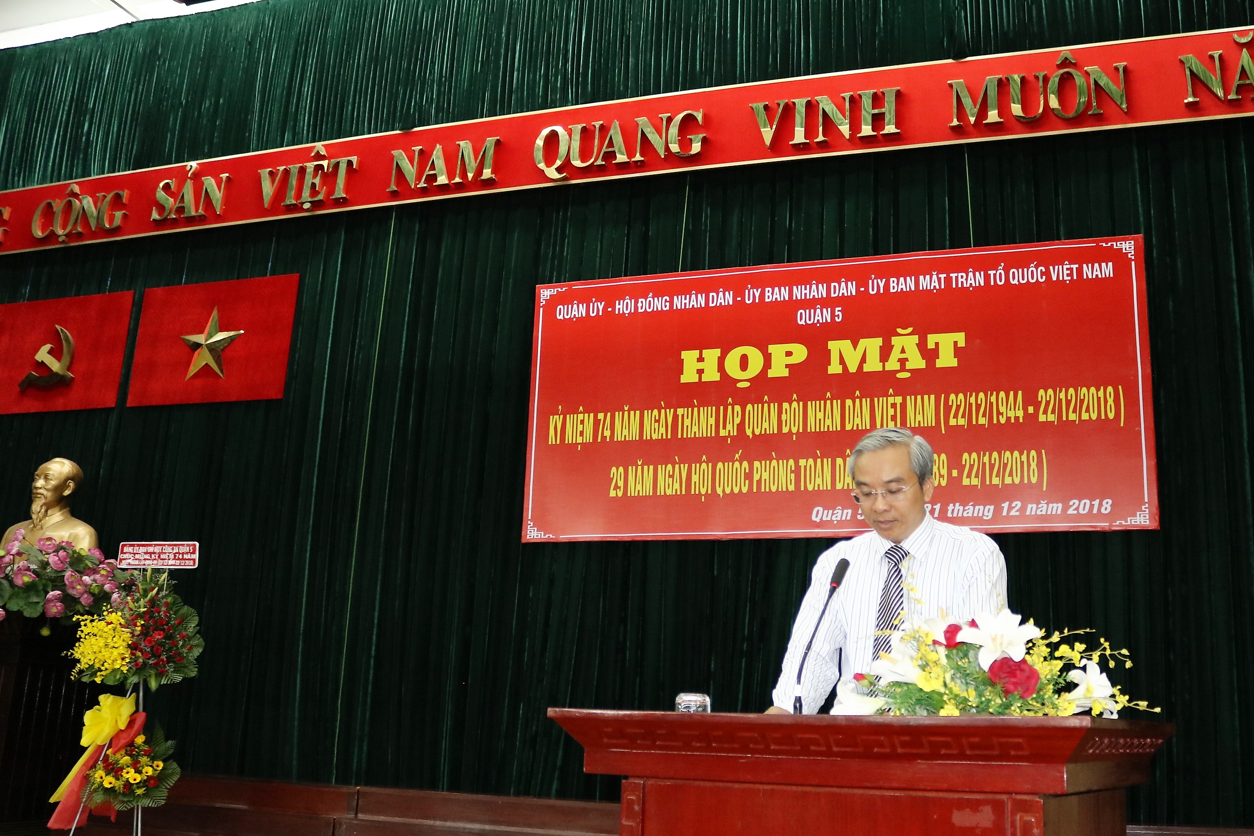 Thay mặt Quận ủy - Hội đồng nhân dân - Ủy ban nhân dân - Ủy ban Mặt trận Tổ quốc Việt Nam quận 5, đồng chí Phạm Quốc Huy, Chủ tịch Ủy ban nhân dân quận 5 phát biểu ôn lại truyền thống vẻ vang của Quân đội nhân dân Việt Nam trong sự nghiệp đấu tranh giải phóng dân tộc, thống nhất Tổ quốc cũng như trong sự nghiệp xây dựng phát triển đất nước hiện nay.