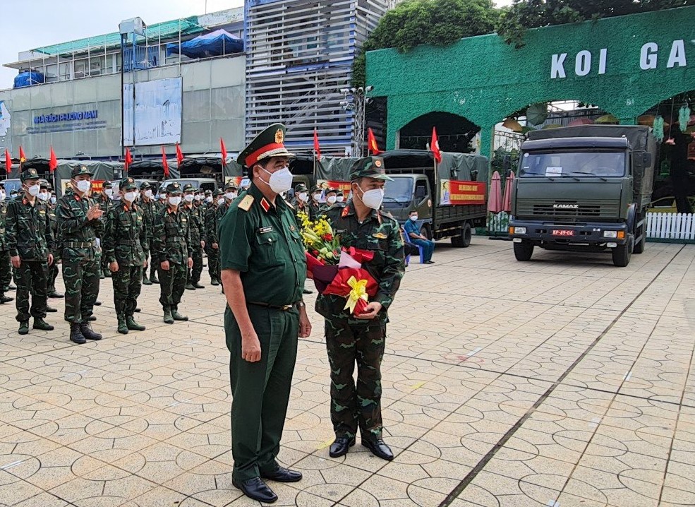 Thiếu tướng Nguyễn Văn Hoàng, Phó Tham mưu trưởng Quân khu 7 tặng hoa chúc mừng Sư đoàn 302 hoàn thành nhiệm vụ giúp Quận 5 chống dịch.