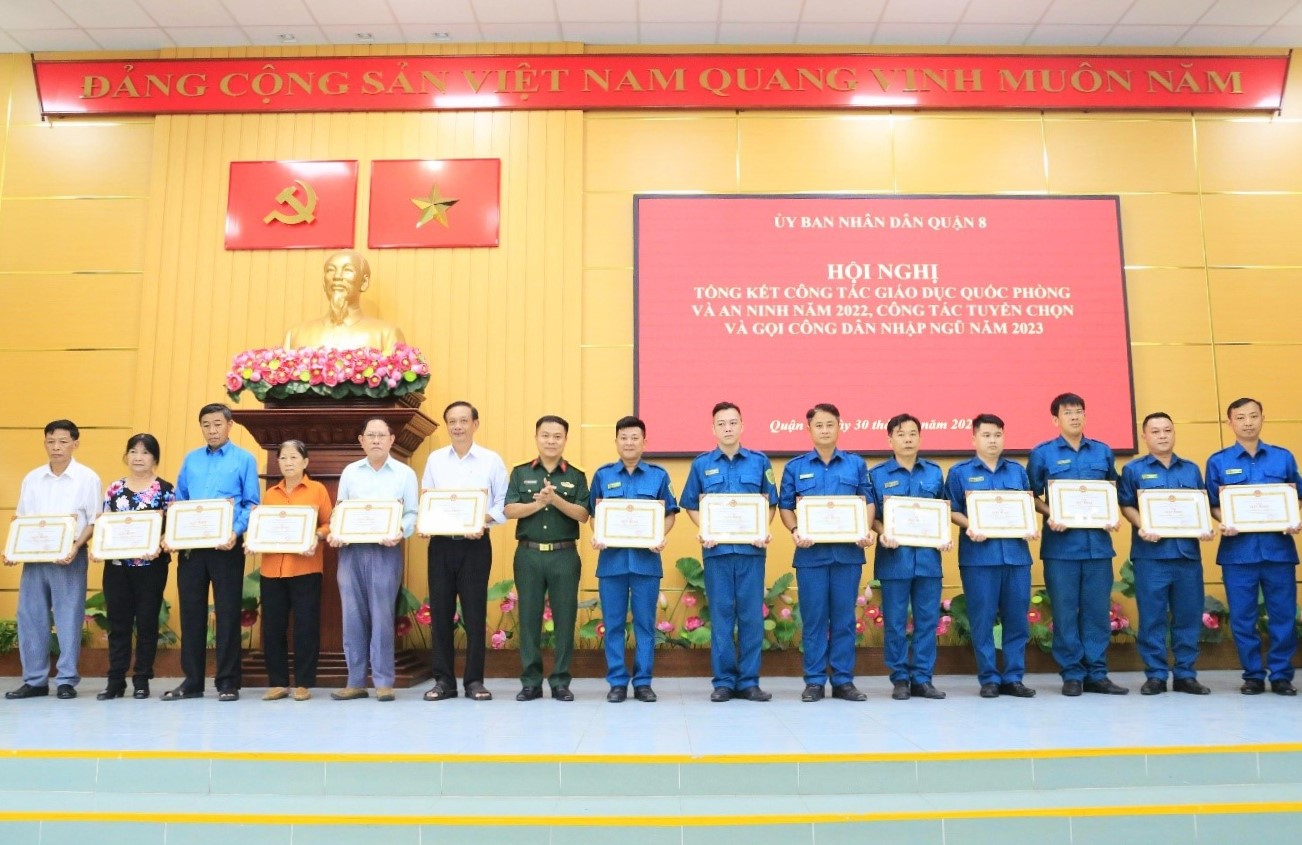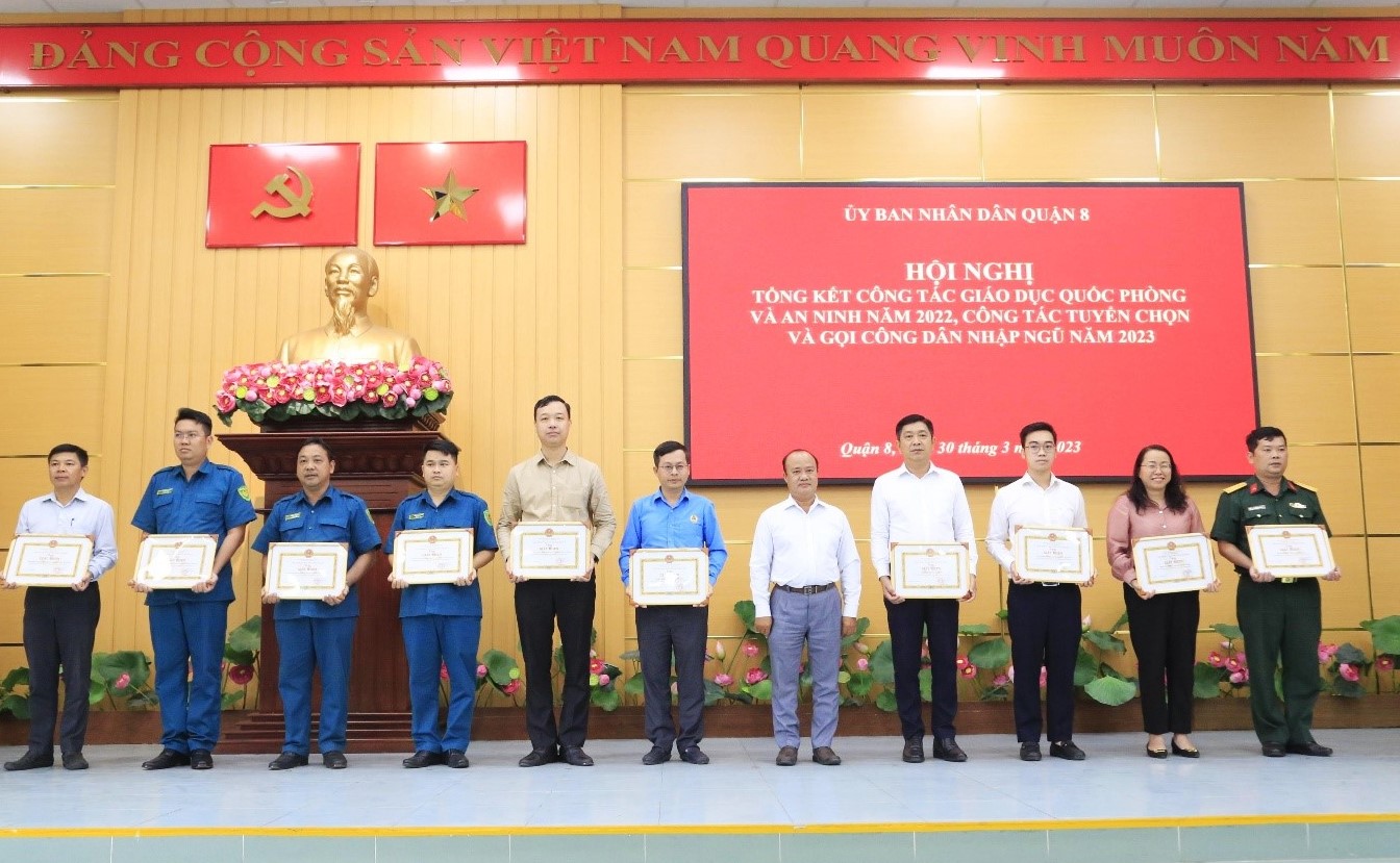UBND Quận 8 tặng giấy khen cho 11 tập thể và 13 cá nhân có thành tích tốt trong công tác giáo dục quốc phòng và an ninh năm 2022; 40 tập thể và 40 cá nhân có thành tích xuất sắc trong công tác tuyển chọn và gọi công dân nhập ngũ năm 2023.