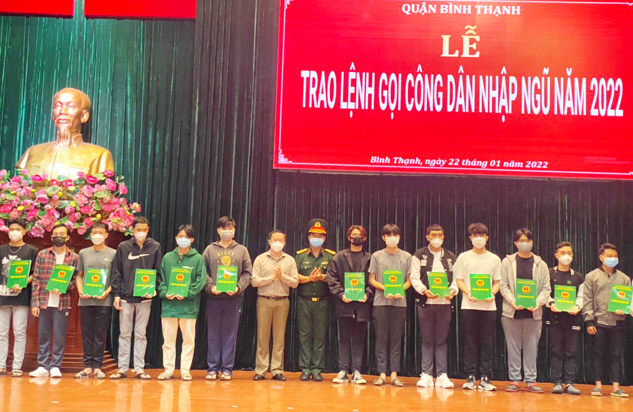 Năm 2022, quận Bình Thạnh được giao chỉ tiêu tuyển chọn và gọi 264 nam công dân trong độ tuổi nhập ngũ, trong đó 220 thanh niên nhập ngũ vào các đơn vị Quân đội và 44 thanh niên thực hiện nghĩa vụ Công an nhân dân. Các các bước phúc tra nắm nguồn, tổ chức xét duyệt và khám sức khỏe chặt chẽ, chu đáo theo đúng quy định, đảm bảo đủ số lượng, chất lượng tuyển quân, theo kế hoạch Lễ giao nhận quân năm 2022 sẽ được tổ chức vào ngày 16/2/2022.