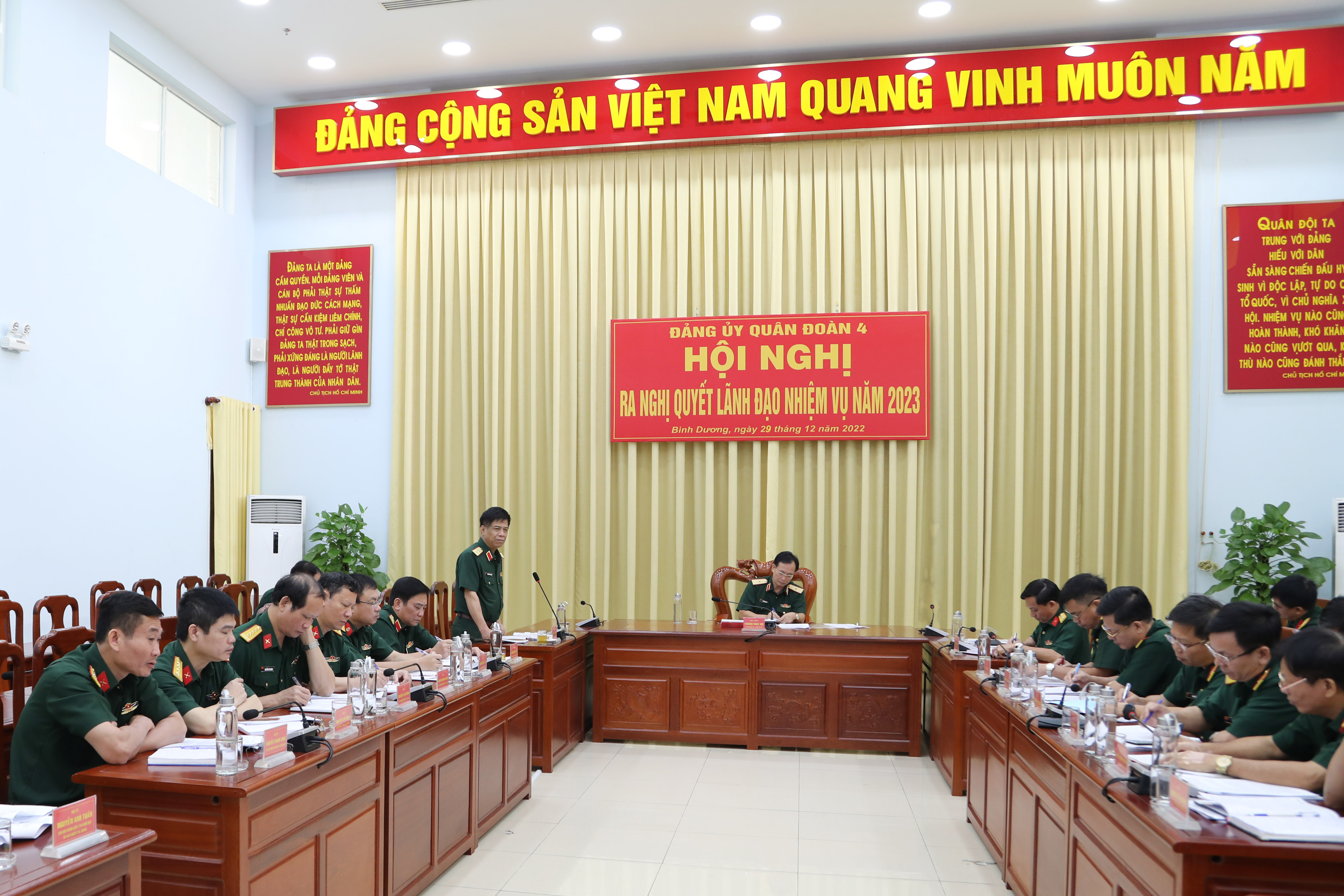 Biểu dương những kết quả mà Đảng ủy Quân đoàn 4 đạt được trong năm 2022, Trung tướng Nguyễn Văn Nghĩa đề nghị thời gian tới, Quân đoàn 4 cần tiếp tục giữ vững mặt trận chính trị tư tưởng; đoàn kết thống nhất, chủ động xây dựng nội dung, chương trình huấn luyện, nhất là tuyển chọn và huấn luyện chiến sĩ mới 2023 đảm bảo chỉ tiêu, chất lượng; dự phòng và luyện tập thuần thục các phương án sẵn sàng chiến đấu; nắm chắc tình hình địa bàn, kịp thời xử lý các tình huống, không để bị động bất ngờ. Đặc biệt, thực hiện tốt đề án xây dựng Quân đội tinh, gọn, mạnh theo đúng chủ trương của Đảng và Bộ Quốc phòng. Trước mắt, tổ chức chu đáo, chặt chẽ cho cán bộ, chiến sĩ đón tết Nguyên đán Quý Mão 2023 vui tươi, an toàn, tiết kiệm và sẵn sàng chiến đấu cao.
