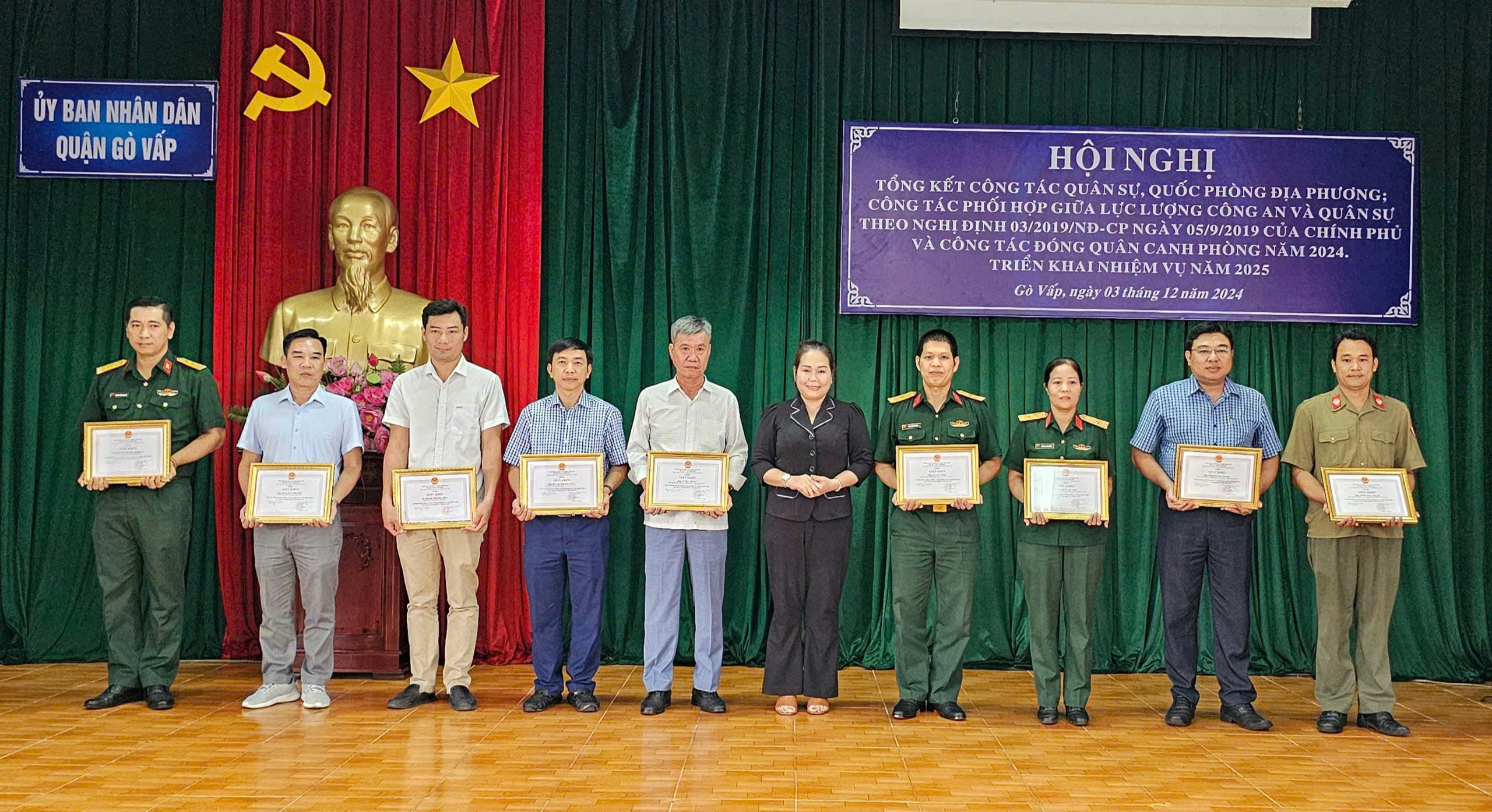Năm 2024, công tác quân sự, quốc phòng địa phương của quận tiếp tục được Quận ủy – UBND quận quan tâm lãnh đạo, chỉ đạo, đạt được những kết quả toàn diện trên các mặt công tác. Quận đã hoàn thành 100% chỉ tiêu giao quân nghĩa vụ quân sự năm 2024. Công tác xây dựng lực lượng dân quân tự vệ toàn quận là 4.267 đồng chí, đạt 1,06% so với dân số. Ra mắt câu lạc bộ võ thuật lực lượng vũ trang và trung tâm văn hóa thể thao quận Gò Vấp năm 2024. Tiếp tục xây dựng khu vực phòng thủ vững chắc, có trọng điểm và chiều sâu, phù hợp với quá trình phát triển kinh tế - xã hội kết hợp với củng cố quốc phòng - an ninh trên địa bàn quận. Công tác Đảng, công tác chính trị được tiếp tục đẩy mạnh và đi vào chiều sâu, trong đó chú trọng xây dựng Đảng bộ trong sạch vững mạnh về chính trị, tư tưởng, đạo đức, tổ chức và cán bộ, lãnh đạo, tổ chức tốt việc quán triệt, học tập, triển khai đồng bộ có hiệu quả các giải pháp, kế hoạch, chương trình hành động thực hiện Nghị quyết Đại hội Đảng các cấp nhiệm kỳ 2020-2025, thực hiện có hiệu quả mô hình “Cán bộ, đảng viên dìu dắt quần chúng và cấp dưới”, mô hình “Chi bộ 5 tốt, đảng viên 5 tốt” gắn với mô hình “Chi bộ 4 tốt, Đảng bộ cơ sở 4 tốt”. Chăm lo Tết cho cán bộ, chiến sĩ đơn vị và Ban CHQS 16 phường; hỗ trợ, chăm lo cho 03 chiến sĩ dân quân nữ tham gia hoạt động kỷ niệm 70 năm Ngày chiến thắng Điện Biên Phủ; thực hiện xây, tặng Nhà “Tình nghĩa quân – dân” năm 2024 tại tỉnh Điện Biên và “nhà đồng đội” tại tỉnh Hà Giang theo chỉ tiêu Bộ Tư lệnh thành phố giao; phối hợp tổ chức đoàn thăm hỏi, giao lưu, tặng quà cho cán bộ, chiến sĩ Đồn Biên phòng Khánh Tiến và Ban CHQS huyện U Minh; tổ chức khám bệnh, phát thuốc, tặng quà cho gia đình chính sách có hoàn cảnh khó khăn trên địa bàn xã Bình Khánh và cán bộ, chiến sĩ Đồn Biên phòng Long Hòa, huyện Cần Giờ; tham gia tổng vệ sinh môi trường dưới dòng rạch Lăng (Phường 5); thăm, chúc Tết cổ truyền “Chol Ch’năm Th’mây” đối với Chi khu Quân sự huyện Baray và chính quyền, đơn vị thuộc tỉnh Kompong Thom, Campuchia với tổng kinh phí hơn 1,49 tỷ và 7.000 USD.