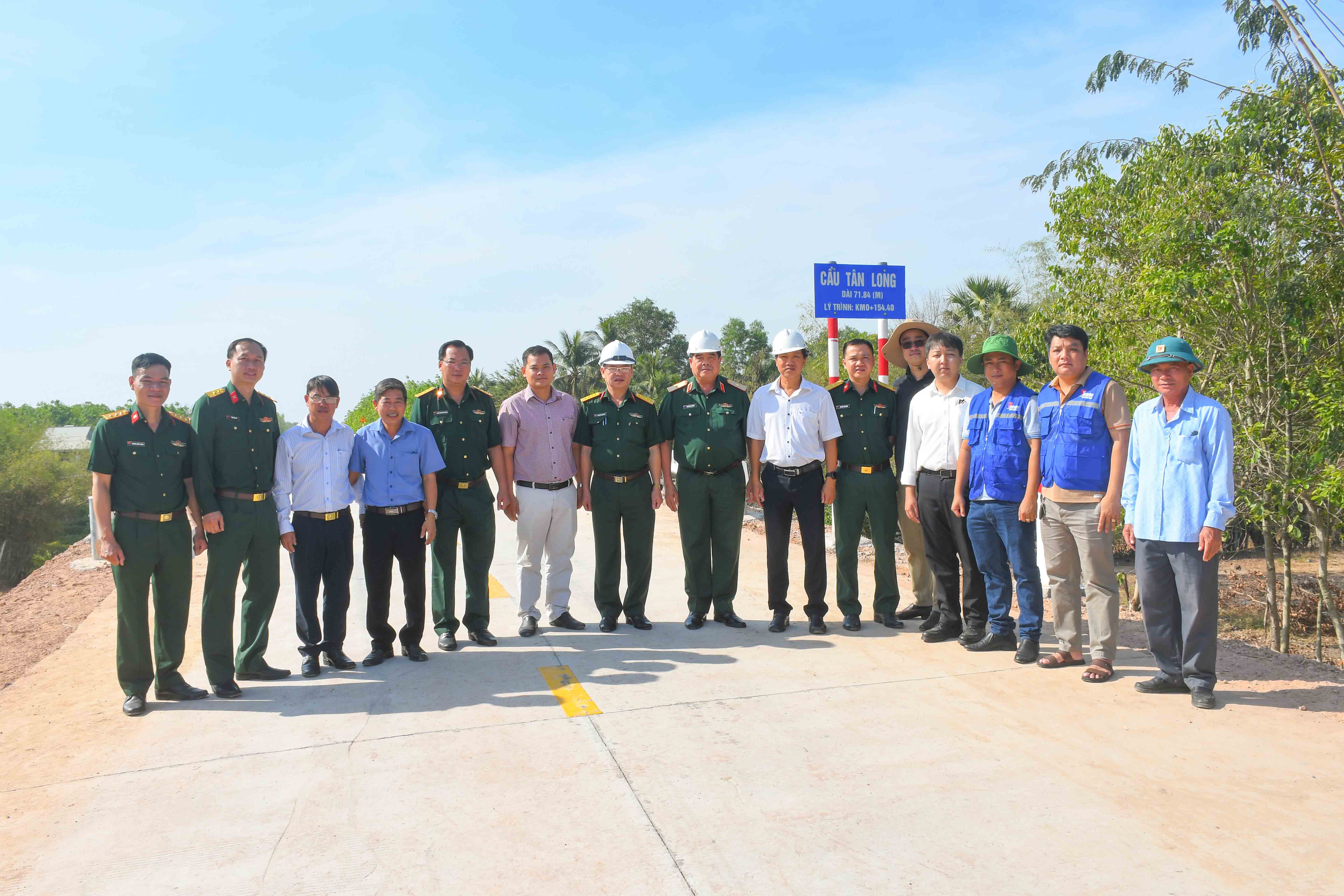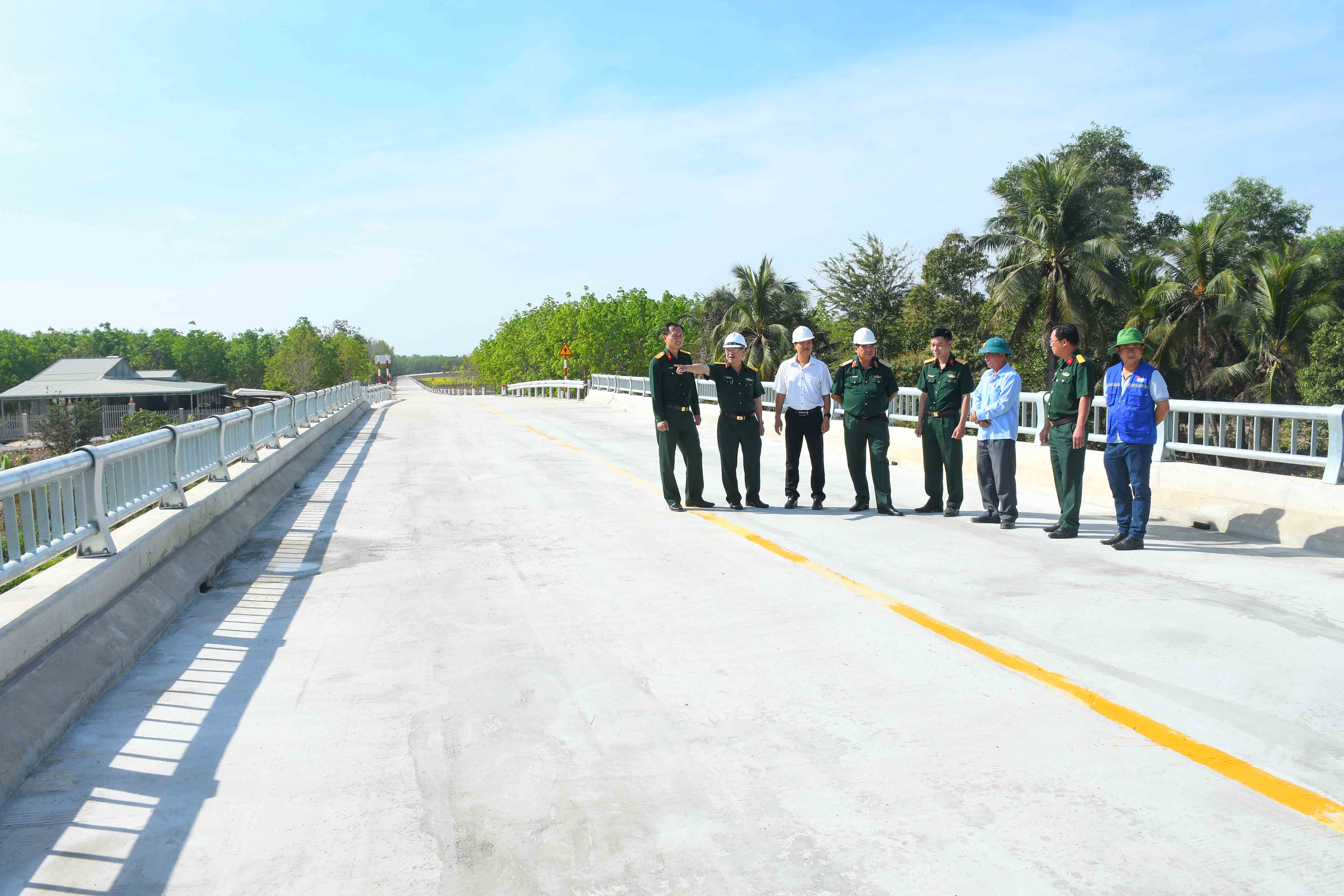 Thiếu tướng Nguyễn Văn Hoàng, Phó Tham mưu trưởng Quân khu và địa phương kiểm tra chất lượng công trình cầu Tân Long.