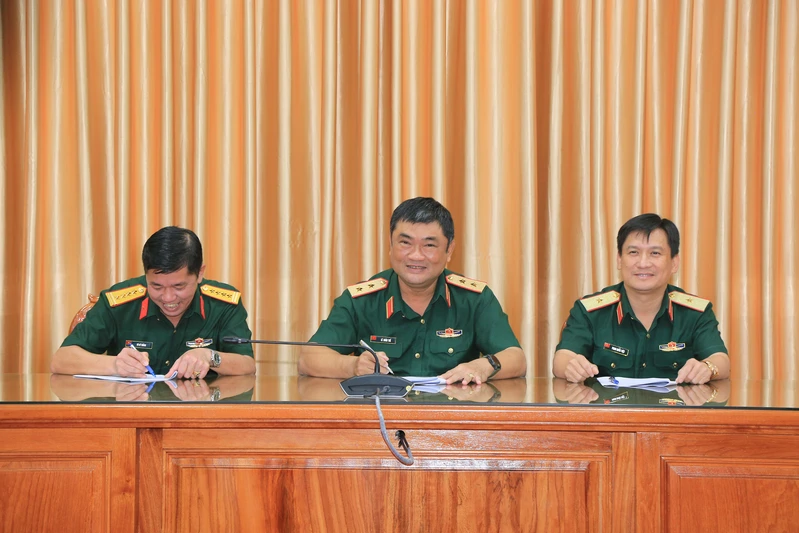 Trung tướng Lê Xuân Thế, Tư lệnh Quân khu 7 (giữa); Thiếu tướng Phan Quốc Việt, Phó Tư lệnh, Tham mưu trưởng Bộ Tư lệnh Thành phố Hồ Chí Minh và Đại tá Vũ Sỹ Thắng, Phó Tư lệnh Binh đoàn 19 ký biên bản bàn giao.