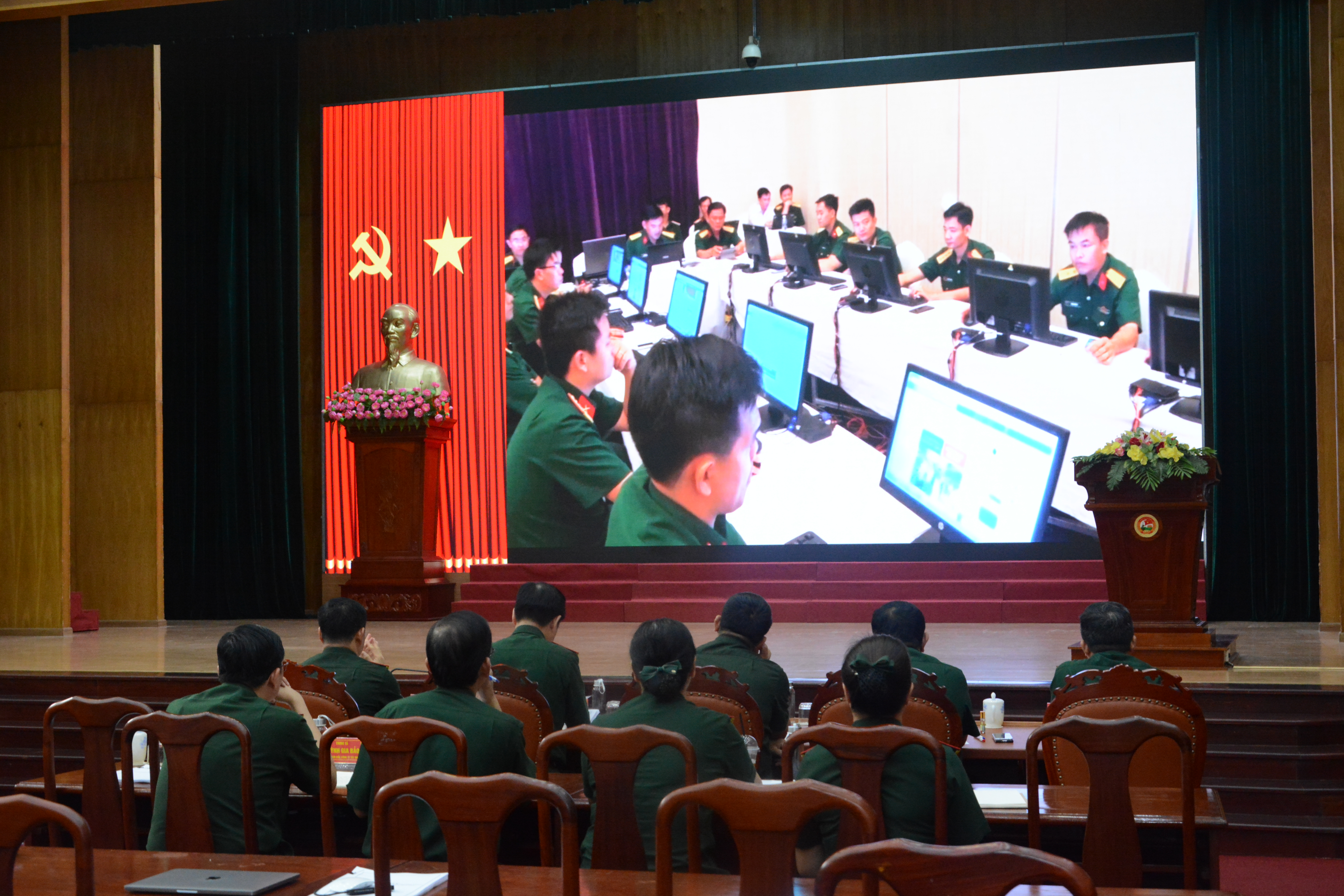 Trung tướng Trần Hoài Trung, Chính ủy Quân khu; Thiếu tướng Trần Vinh Ngọc, Phó Chính ủy Quân khu cùng Thủ trưởng cơ quan Quân khu theo dõi báo cáo trung tâm Đại hội.