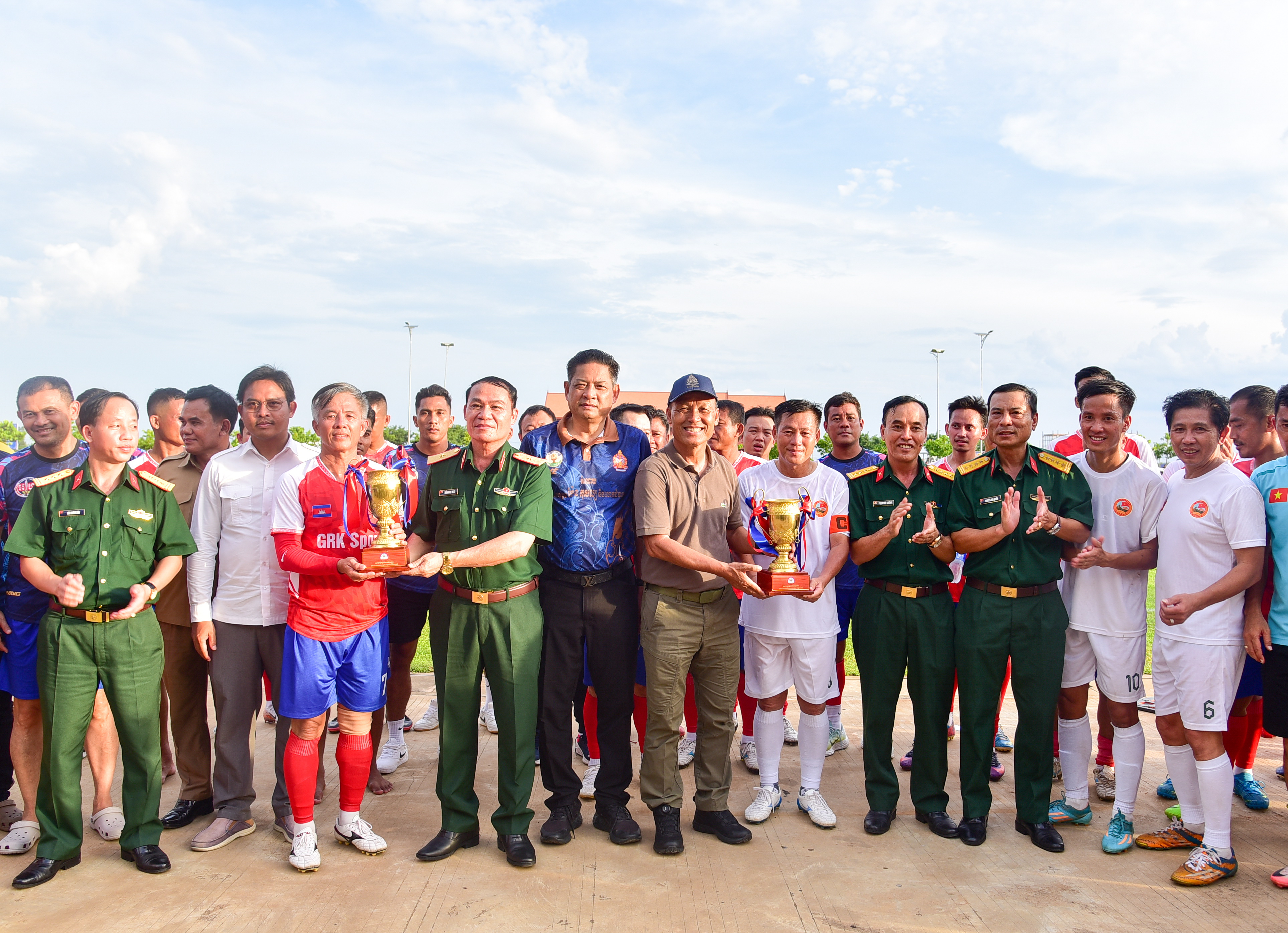 Thiếu tướng Trần Ngọc Minh, Phó Tư lệnh Quân khu 7; Thống tướng Sao Sokha, Phó Tổng Tư lệnh, Tư lệnh Hiến binh Quân đội Hoàng gia Campuchia trao cúp cho 2 đội Bộ Tư lệnh Quân khu 7 và Bộ Tư lệnh Hiến binh Quân đội Hoàng gia Campuchia tham gia giao hữu bóng đá.