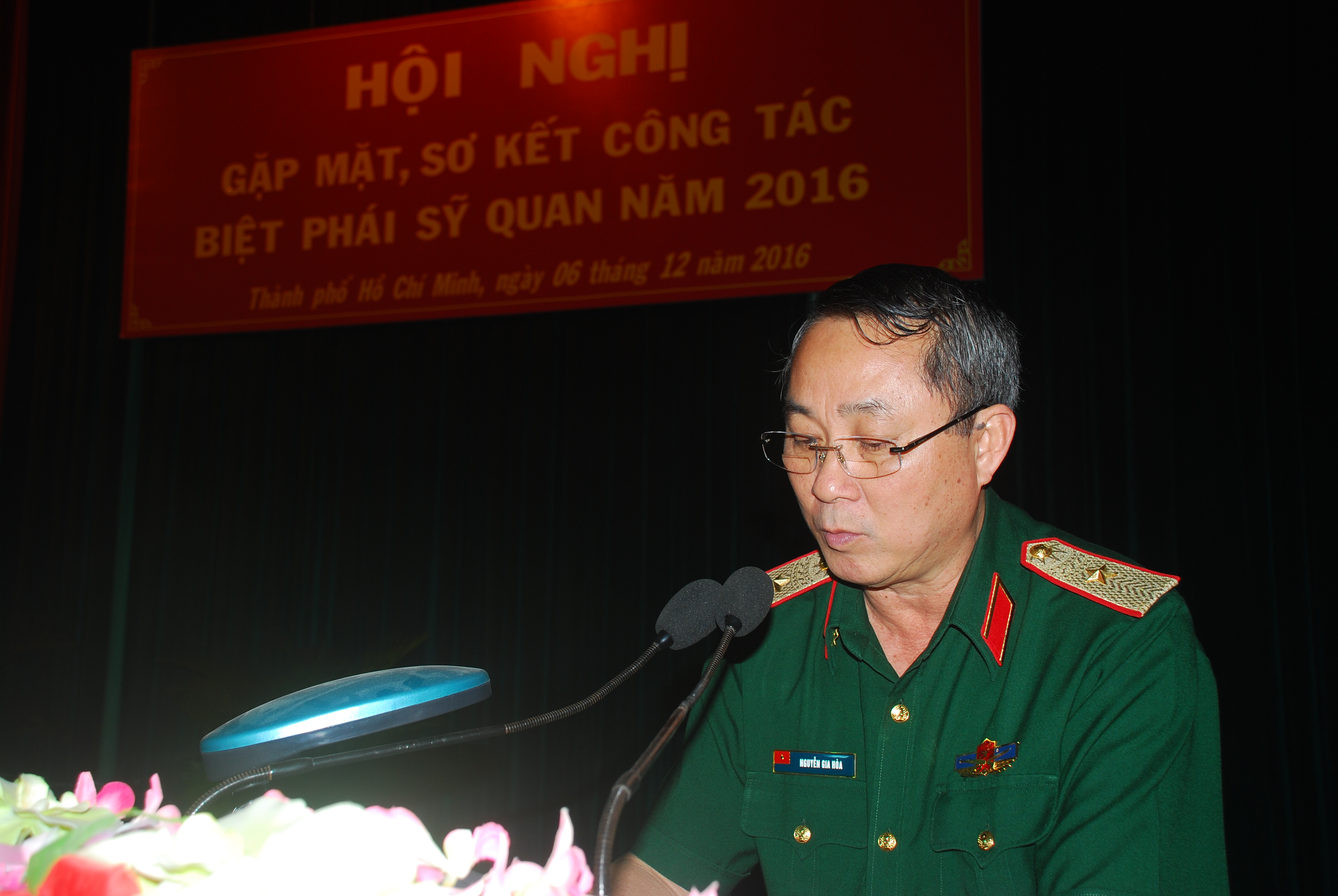 Thiếu tướng Nguyễn Gia Hòa, Chủ nhiệm Chính trị Quân khu báo cáo kết quả thực hiện công tác biệt phái sĩ quan năm 2016