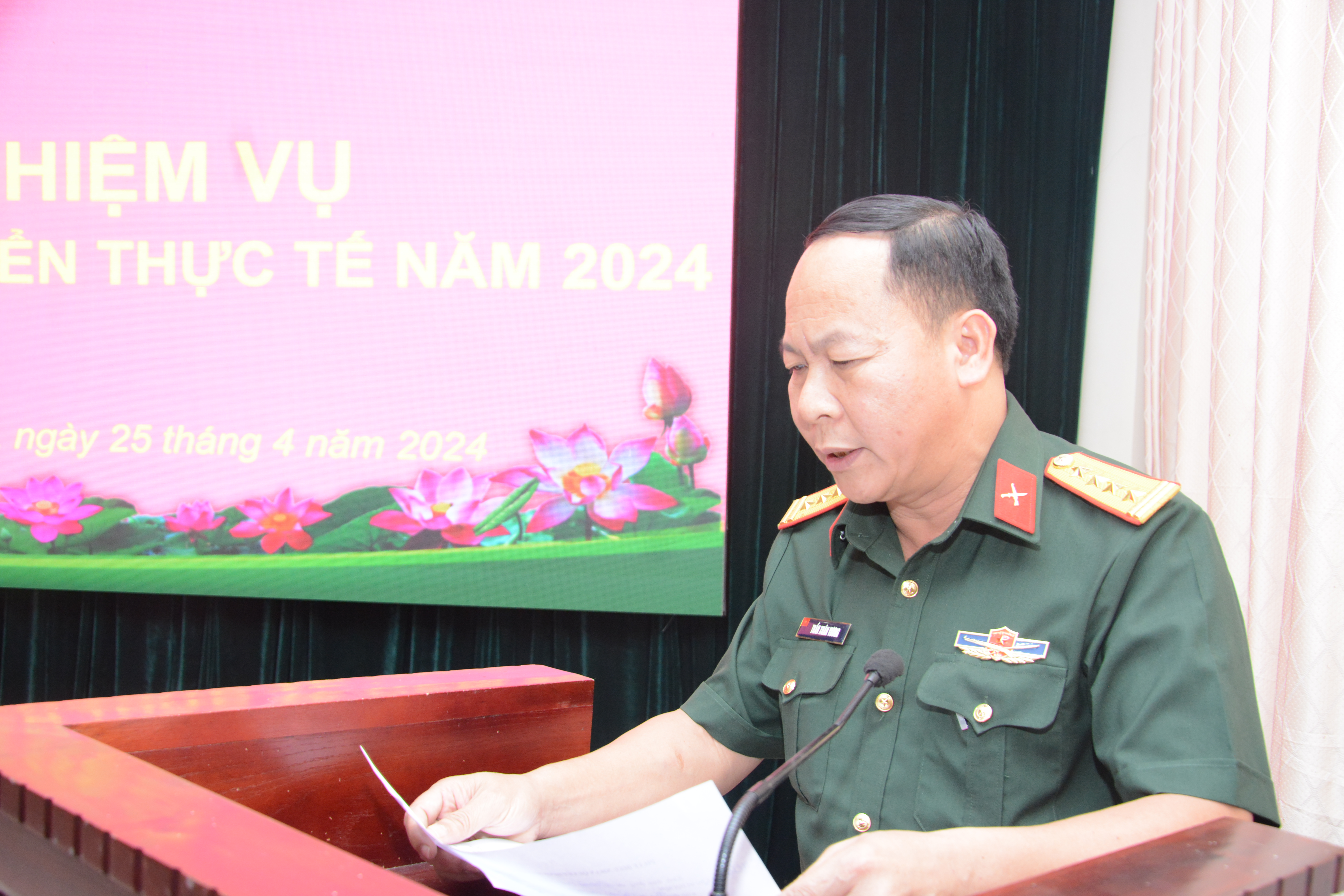 Thiếu tướng Hoàng Đình Chung, Ủy viên Thường vụ Đảng ủy Quân khu, Chủ nhiệm Chính trị Quân khu phát biểu giao nhiệm vụ cho các đồng chí cán bộ đi luân chuyển thực tế tại các đơn vị trực thuộc Quân khu.