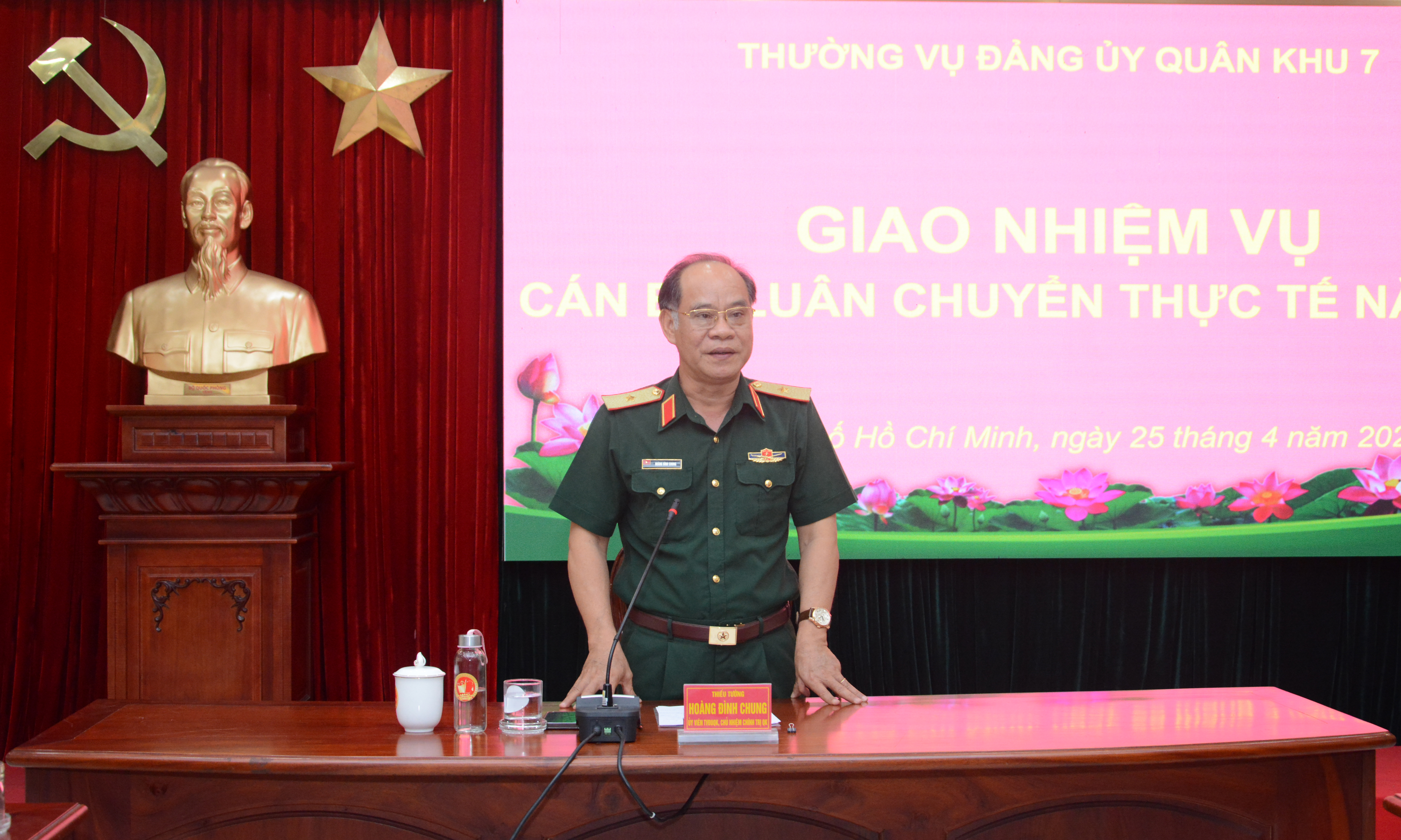 Thiếu tướng Hoàng Đình Chung, Chủ nhiệm Chính trị Quân khu chúc mừng các đồng chí cán bộ đã được thủ trưởng các cấp quan tâm, tạo điều kiện cho đi luân chuyển để tích lũy thêm kinh nghiệm công tác quốc phòng, quân sự địa phương từ thực tiễn cơ sở. Đồng thời, thông tin đến các đồng chí cán bộ luân chuyển về đặc điểm tình hình địa bàn Quân khu 7; sự phát triển kinh tế, văn hóa, xã hội, công tác dân tộc, tôn giáo; kết quả hoạt động của LLVT Quân khu 7 trong thời gian qua, nổi bật với nhiều chủ trương, đề án, mô hình sáng tạo hiệu quả, có ý nghĩa chính trị, xã hội sâu sắc…
