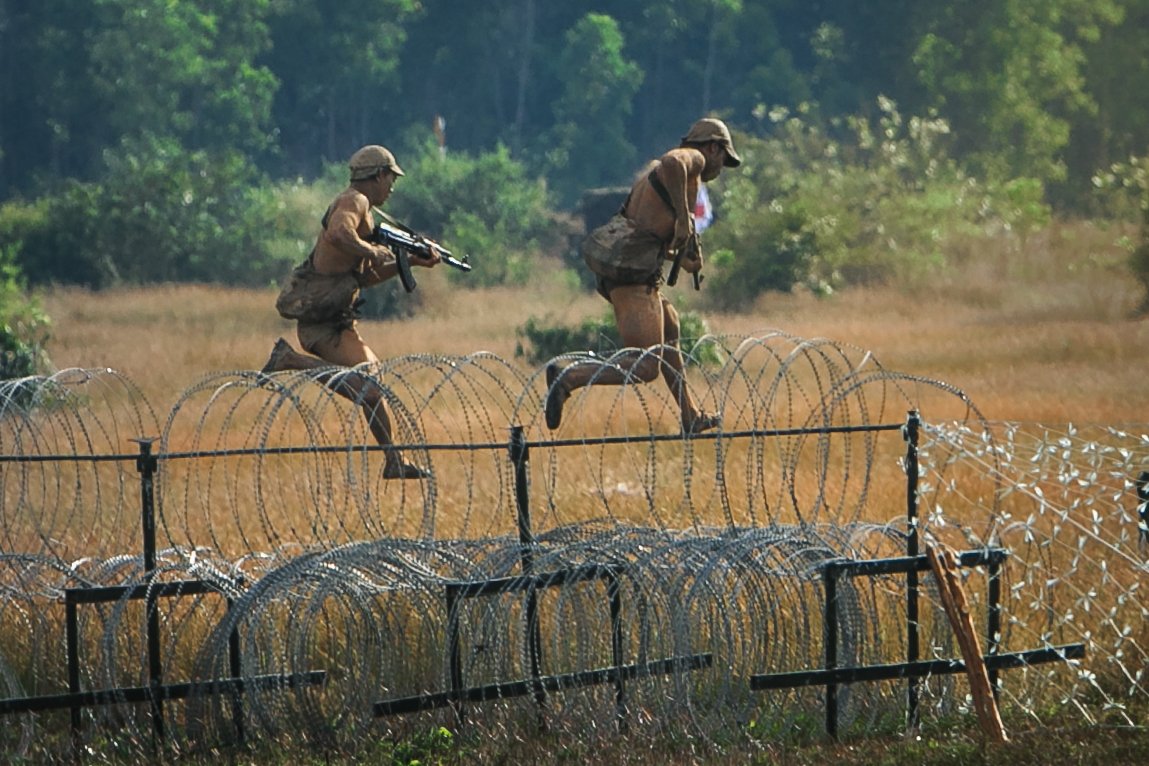 Bộ đội đặc công Quân khu vượt hàng rào kẽm gai tập kích trận địa pháo binh địch.