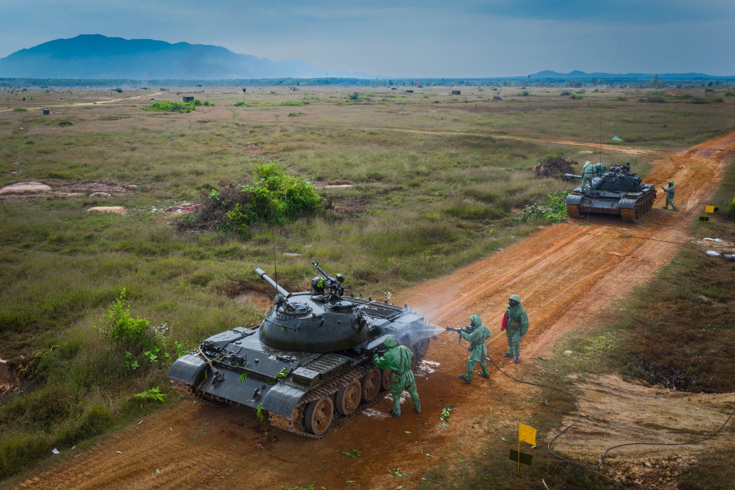 Lực lượng Phòng hóa Quân khu tiến hành phun khử khuẩn xe tăng từ trận địa trở về.
