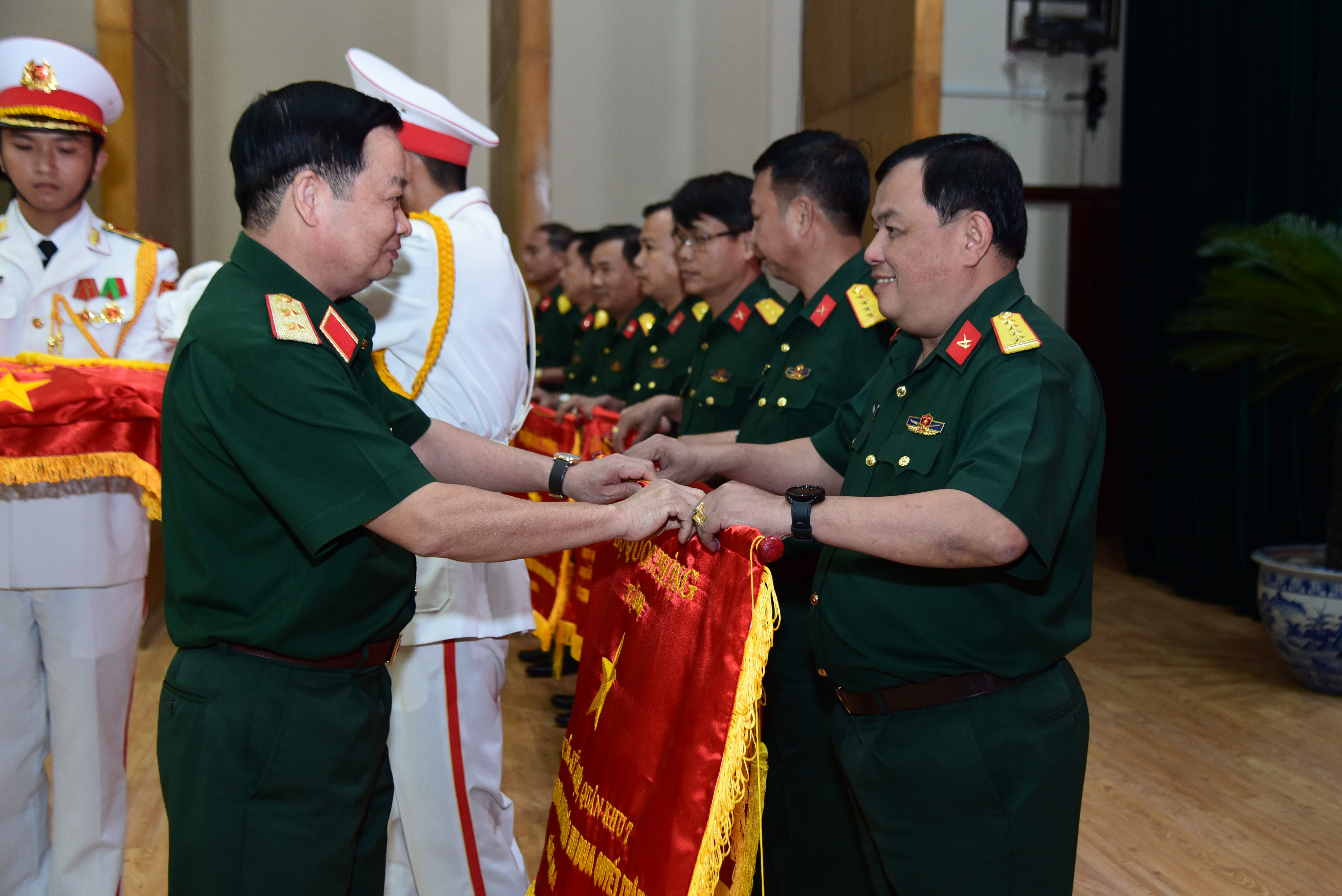 Trung tướng Trần Hoài Trung, Chính ủy Quân khu trao Cờ thi đua của Bộ Quốc phòng cho 14 tập thể (Ảnh: Tuấn Anh).