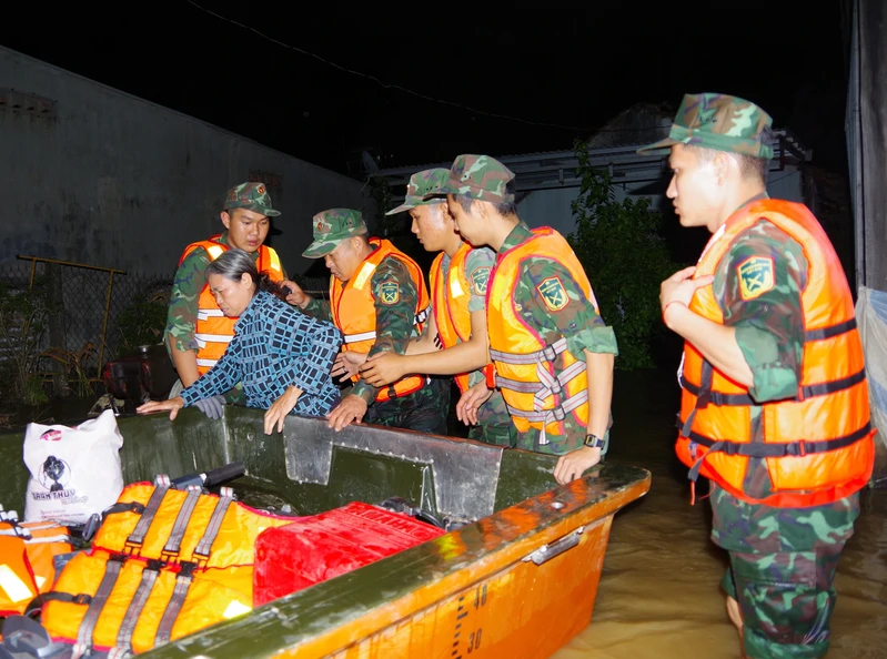 Cán bộ, chiến sĩ LLVT Quân khu 7 vận chuyển, sơ tán nhân dân trong đêm.